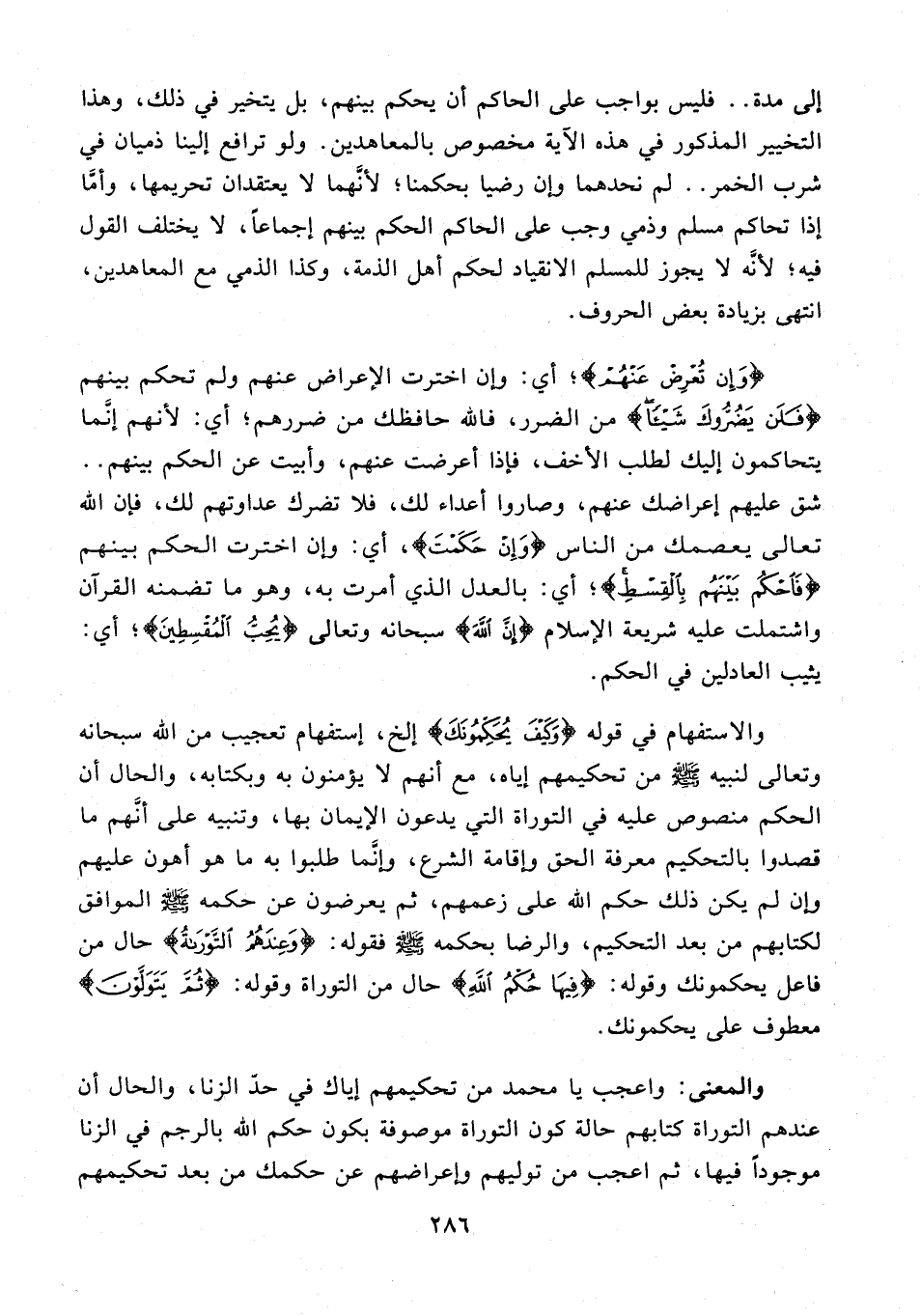 إلى مدة .. فليس بواجب على الحاكم أن يحكم بينهم، بل يتخير في ذلك، وهذا التخيير المذكور في هذه الآية مخصوص بالمعاهدين. ولو ترافع إلينا ذميان في شرب الخمر .. لم نحدهما وإن رضيا بحكمنا؛ لأنهما لا يعتقدان تحريمها، وأمَّا إذا تحاكم مسلم وذمي وجب على الحاكم الحكم بينهم إجماعًا، لا يختلف القول فيه؛ لأنَّه لا يجوز للمسلم الانقياد لحكم أهل الذمة، وكذا الذمي مع المعاهدين، انتهى بزيادة بعض الحروف.