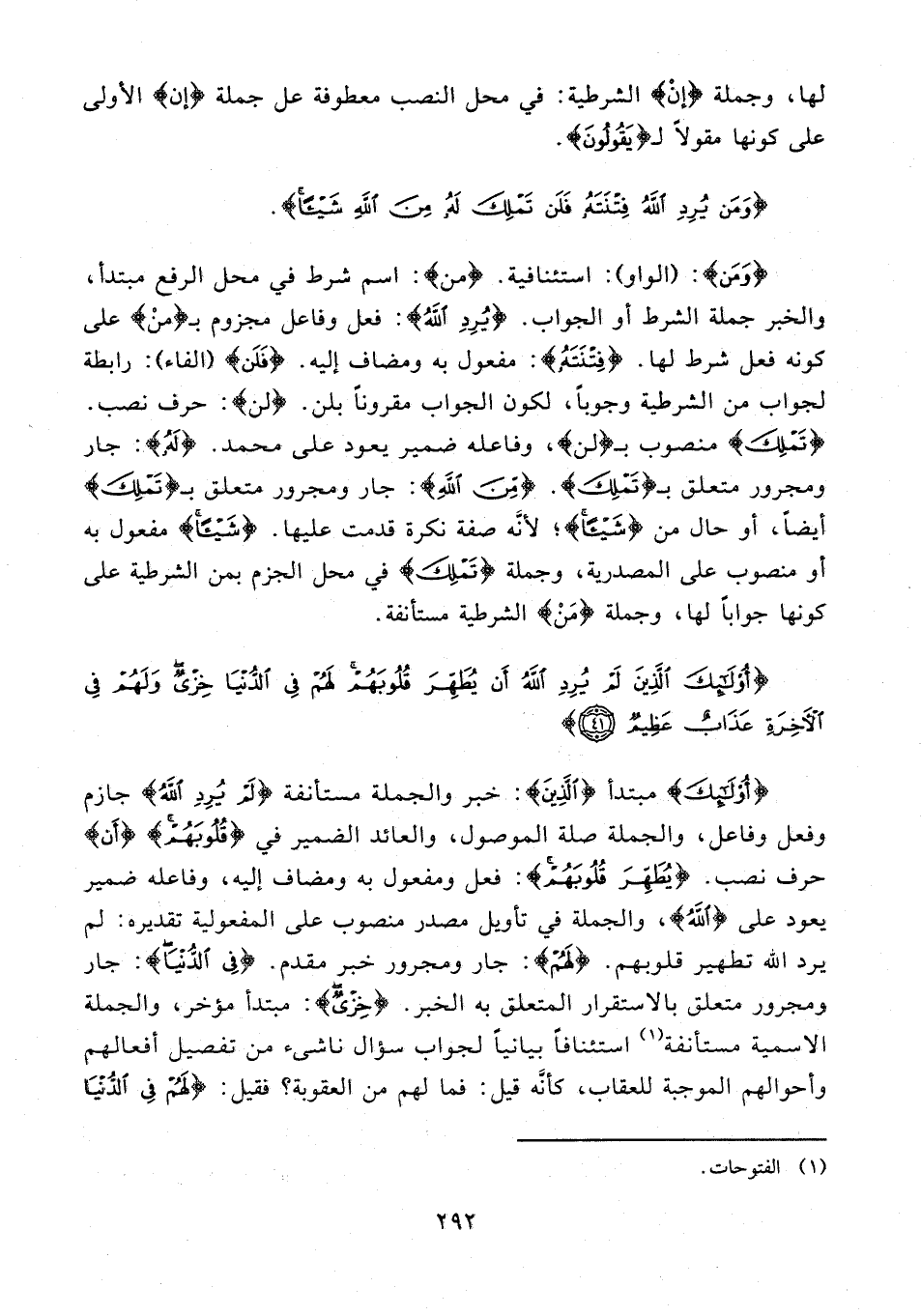{وَمَنْ}: {الواو}: استئنافية. {مَنْ}: اسم شرط في محل الرفع مبتدأ، والخبر جملة الشرط أو الجواب. {يُرِدِ اللَّهُ}: فعل وفاعل مجزوم بـ {مَنْ} على كونه فعل شرط لها. {فِتْنَتَهُ}: مفعول به ومضاف إليه. {فَلَنْ} (الفاء) رابطة لجواب من الشرطية وجوبًا، لكون الجواب مقرونًا بلن. {لن}: حرف نصب. {تَمْلِكَ} منصوب بـ {لن}، وفاعله ضمير يعود على محمد. {لَنْ}: جار ومجرور متعلق بـ {تَمْلِكَ}. {مِنَ اللَّهِ}: جار ومجرور متعلق بـ {تَمْلِكَ} أيضًا، أو حال من {شَيْئًا}؛ لأنّه صفة نكرة قدمت عليها. {شَيْئًا} مفعول به أو منصوب على المصدرية، وجملة {تَمْلِكَ} في محل الجزم بمن الشرطية على كونها جوابًا لها، وجملة {مِنَ} الشرطية مستأنفة.