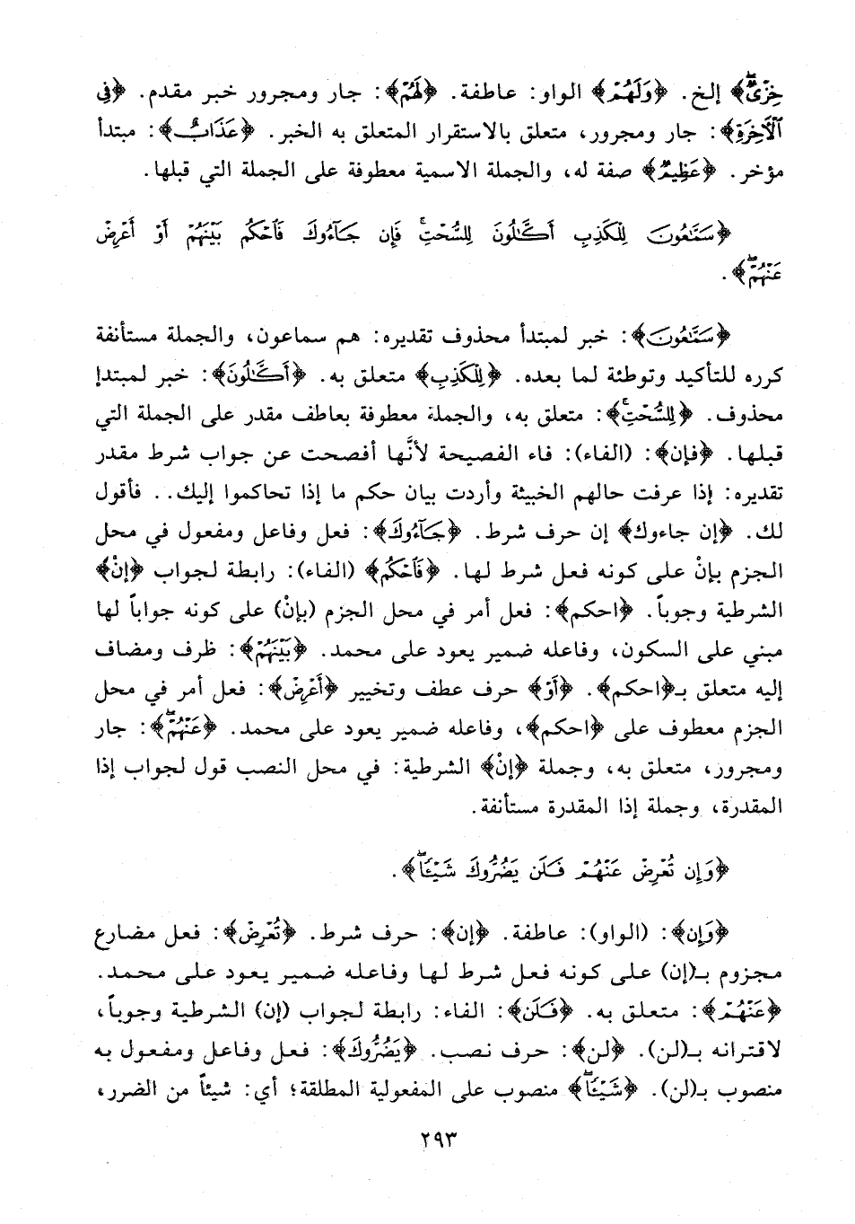 {سَمَّاعُونَ}: خبر لمبتدأ محذوف تقديره: هم سماعون، والجملة مستأنفة كرره للتأكيد وتوطئة لما بعده. {لِلْكَذِبِ} متعلق به. {أَكَّالُونَ}: خبر لمبتدإ محذوف. {لِلسُّحْتِ}: متعلق به، والجملة معطوفة بعاطف مقدر على الجملة التي قبلها. {فَإِنْ}: {الفاء}: فاء الفصيحة لأنَّها أفصحت عن جواب شرط مقدر تقديره: إذا عرفت حالهم الخبيثة وأردت بيان حكم ما إذا تحاكموا إليك .. فأقول لك. {إن جاءوك} إن حرف شرط. {جَاءُوكَ}: فعل وفاعل ومفعول في محل الجزم بإنْ على كونه فعل شرط لها. {فَاحْكُمْ} {الفاء}: رابطة لجواب {إنْ} الشرطية وجوبًا. {احْكُمْ}: فعل أمر في محل الجزم (بإنْ) على كونه جوابًا لها مبني على السكون، وفاعله ضمير يعود على محمَّد. {بَيْنَهُمْ}: ظرف ومضاف إليه متعلق بـ {احْكُمْ}. {أَوْ} حرف عطف وتخيير {أَعْرِضْ}: فعل أمر في محل الجزم معطوف على {احْكُمْ}، وفاعله ضمير يعود على محمَّد. {عَنْهُمْ}: جار ومجرور، متعلق به، وجملة {إِنْ} الشرطية: في محل النصب قول لجواب إذا المقدرة، وجملة إذا المقدرة مستأنفة.