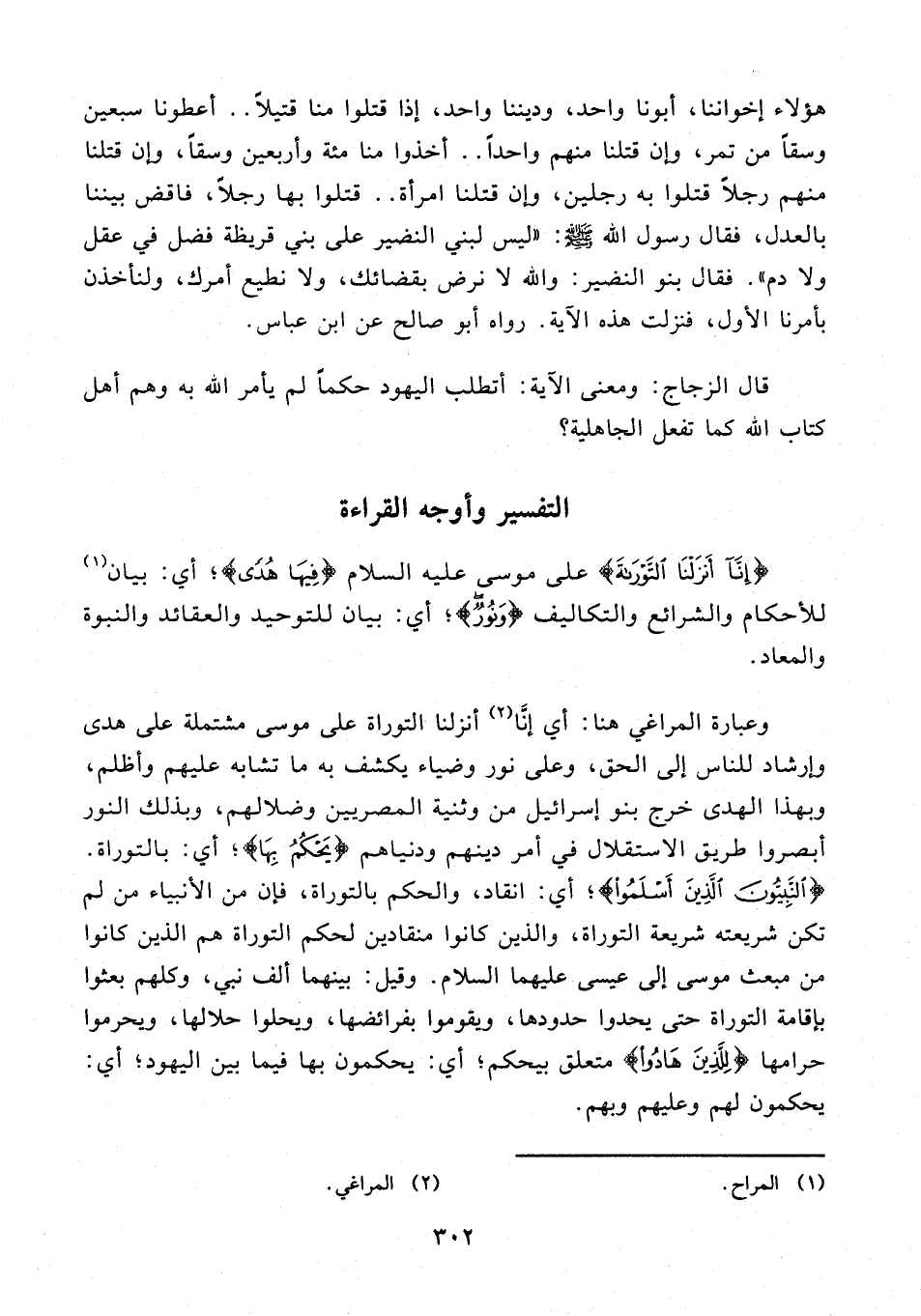 44 - {إِنَّا أَنْزَلْنَا التَّوْرَاةَ} على موسى عليه السلام {فِيهَا هُدًى}؛ أي: بيان (¬1) للأحكام والشرائع والتكاليف {وَنُورٌ}؛ أي: بيان للتوحيد والعقائد والنبوة والمعاد.