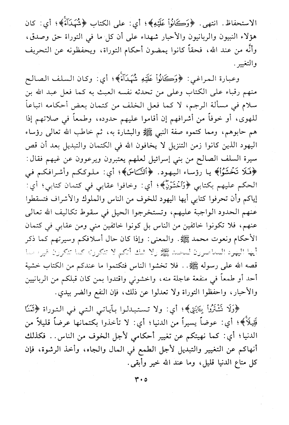 وعبارة المراغي: {وَكَانُوا عَلَيْهِ شُهَدَاءَ}؛ أي: وكان السلف الصالح منهم رقباء على الكتاب وعلى من تحدثه نفسه العبث به كما فعل عبد الله بن سلام في مسألة الرجم، لا كما فعل الخلف من كتمان بعض أحكامه اتباعًا للهوى، أو خوفًا من أشرافهم إن أقاموا عليهم حدوده، وطمعًا في صلاتهم إذا هم حابوهم، ومما كتموه صفة النبي - صلى الله عليه وسلم - والبشارة به، ثم خاطب الله تعالى رؤساء اليهود الذين كانوا زمن التنزيل لا يخافون الله في الكتمان والتبديل بعد أن قص سيرة السلف الصالح من بني إسرائيل لعلهم يعتبرون ويرعوون عن غيهم فقال: {فَلَا تَخْشَوُا} يا رؤساء اليهود. {النَّاسَ}؛ أي: ملوككم وأشرافكم في الحكم عليهم بكتابي {وَاخْشَوْنِ}؛ أي: وخافوا عقابي في كتمان كتابي؛ أي: إياكم وأن تحرفوا كتابي أيها اليهود للخوف من الناس والملوك والأشراف فتسقطوا عنهم الحدود الواجبة عليهم، وتستخرجوا الحيل في سقوط تكاليف الله تعالى عنهم، فلا تكونوا خائفين من الناس بل كونوا خائفين مني ومن عقابي في كتمان الأحكام ونعوت محمد - صلى الله عليه وسلم -. والمعنى: وإذا كان حال أسلافكم وسيرتهم كما ذكر أيها اليهود المعاصرون لمحمد - صلى الله عليه وسلم - ولا شك أنكم لا تنكرونه كما تنكرون غيره مما قصه الله على رسوله - صلى الله عليه وسلم - .. فلا تخشوا الناس فتكتموا ما عندكم من الكتاب خشية أحد أو طمعًا في منفعة عاجلة منه، واخشوني واقتدوا بمن كان قبلكم من الربانيين والأحبار, واحفظوا التوراة ولا تعدلوا عن ذلك، فإن النفع والضر بيدي.