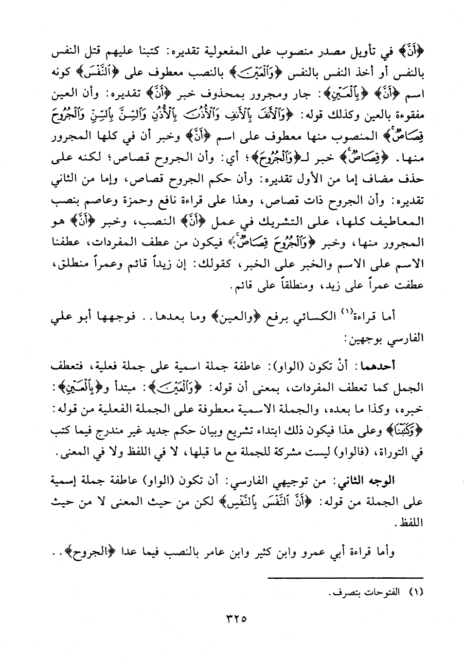 الوجه الثاني: من توجيهي الفارسي: أن تكون (الواو) عاطفة جملة إسمية على الجملة من قوله: {أَنَّ النَّفْسَ بِالنَّفْسِ} لكن من حيث المعنى لا من حيث اللفظ.