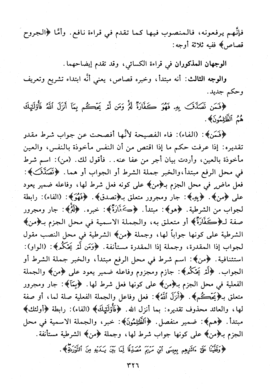 {فَمَنْ}: (الفاء): فاء الفصيحة لأنَّها أفصحت عن جواب شرط مقدر تقديره: إذا عرفت حكم ما إذا اقتص من أن النفس مأخوذة بالنفس، والعين مأخوذة بالعين، وأردت بيان أجر من عما عنه .. فأقول لك. (من): اسم شرط في محل الرفع مبتدأ، والخبر جملة الشرط أو الجواب أو هما. {تَصَدَّقَ}: فعل ماضٍ في محل الجزم بـ {من} على كونه فعل شرط لها، وفاعله ضمير يعود على {من}. {بِهِ}: جار ومجرور متعلق بـ {تَصَدَّقَ}. {فَهُوَ}: (الفاء): رابطة لجواب من الشرطية. {هُوَ}: مبتدأ. {كَفَّارَةٌ}: خبره. {لَهُ}: جار ومجرور صفة لـ {كَفَّارَةٌ} أو متعلق به، والجملة الإسمية في محل الجزم بـ {من} الشرطية على كونها جوابًا لها، وجملة {من} الشرطية في محل النصب مقول لجواب إذا المقدرة، وجملة إذا المقدرة مستأنفة. {وَمَنْ لَمْ يَحْكُمْ}: (الواو): استئنافية. {من}: اسم شرط في محل الرفع مبتدأ، والخبر جملة الشرط أو الجواب. {لَمْ يَحْكُمْ}: جازم ومجزوم وفاعله ضمير يعود على {من} والجملة الفعلية في محل الجزم بـ {من} على كونها فعل شرط لها. {بِمَا}: جار ومجرور متعلق بـ {يَحْكُمْ}. {أَنْزَلَ اللَّهُ}: فعل وفاعل والجملة الفعلية صلة لما، أو صفة لها، والعائد محذوف تقديره: بما أنزل الله. {فَأُولَئِكَ} (الفاء): رابطة {أولئك} مبتدأ. {هم}: ضمير منفصل. {الظَّالِمُونَ}: خبر، والجملة الإسمية في محل الجزم بـ {من} على كونها جواب شرط لها، وجملة {من} الشرطية مستأنفة.