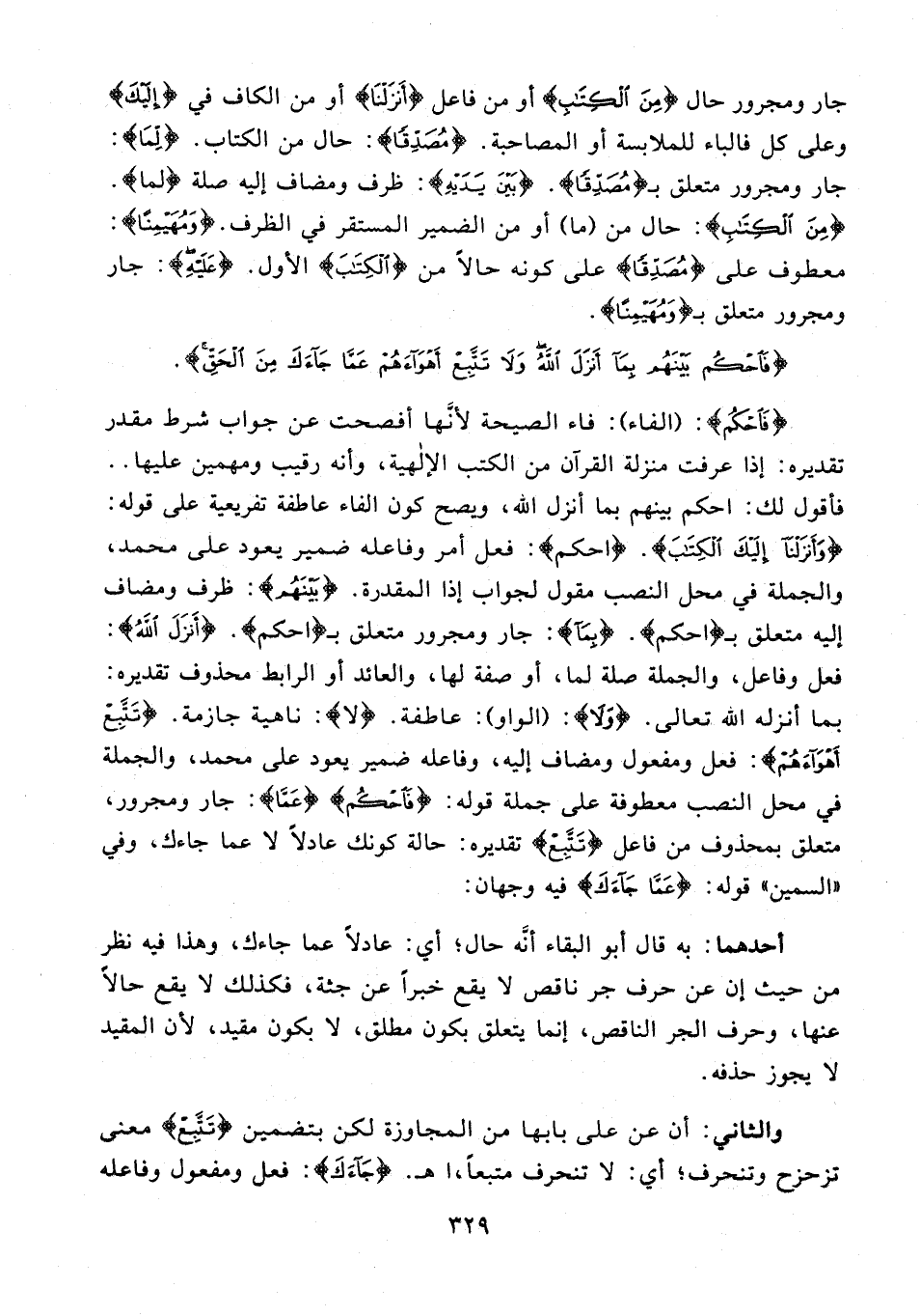 {فَاحْكُمْ}: (الفاء): فاء الصيحة لأنَّها أفصحت عن جواب شرط مقدر تقديره: إذا عرفت منزلة القرآن من الكتب الإلهية، وأنه رقيب ومهمين عليها .. فأقول لك: احكم بينهم بما أنزل الله، ويصح كون الفاء عاطفة تفريعية على قوله: {وَأَنْزَلْنَا إِلَيْكَ الْكِتَابَ}. {احكم}: فعل أمر وفاعله ضمير يعود على محمد، والجملة في محل النصب مقول لجواب إذا المقدرة. {بَيْنَهُمْ}: ظرف ومضاف إليه متعلق بـ {احْكُمْ}. {بِمَا}: جار ومجرور متعلق بـ {احكم} {أَنْزَلَ اللَّهُ}: فعل وفاعل، والجملة صلة لما، أو صفة لها، والعائد أو الرابط محذوف تقديره: بما أنزله الله تعالى. {وَلَا}: (الواو): عاطفة. لا: ناهية جازمة. {تَتَّبِعْ أَهْوَاءَهُمْ}: فعل ومفعول ومضاف إليه، وفاعله ضمير يعود على محمد، والجملة في محل النصب معطوفة على جملة قوله: {فَاحْكُمْ} {عَمَّا}: جار ومجرور، متعلق بمحذوف من فاعل {تَتَّبِعْ} تقديره: حالة كونك عادلًا لا عما جاءك، وفي "السمين" قوله: {عَمَّا جَاءَكَ} فيه وجهان: