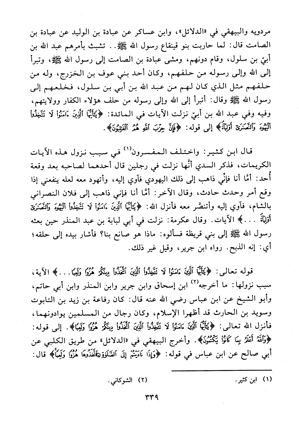 مردويه والبيهقي في "الدلائل"، وابن عساكر عن عبادة بن الوليد عن عبادة بن الصامت قال: لما حاربت بنو قينقاع رسول الله - صلى الله عليه وسلم - .. تشبث بأمرهم عبد الله بن أبيّ بن سلول، وقام دونهم، ومشى عبادة بن الصامت إلى رسول الله - صلى الله عليه وسلم -، وتبرأ إلى الله وإلى رسوله من حلفهم، وكان أحد بني عوف بن الخزرج، وله من حلفهم مثل الذي كان لهم من عبد الله بن أبي بن سلول، فخلعهم إلى رسول الله - صلى الله عليه وسلم - وقال: أتبرأ إلى الله وإلى رسوله من حلف هؤلاء الكفار وولايتهم، وفيه وفي عبد الله بن أبيّ نزلت الآيات في المائدة: {يَا أَيُّهَا الَّذِينَ آمَنُوا لَا تَتَّخِذُوا الْيَهُودَ وَالنَّصَارَى أَوْلِيَاءَ} إلى قوله: {فَإِنَّ حِزْبَ اللَّهِ هُمُ الْغَالِبُونَ}.