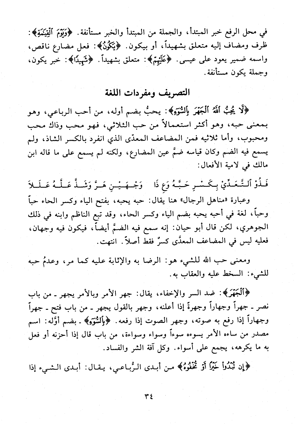 {لَا يُحِبُّ اللَّهُ الْجَهْرَ بِالسُّوءِ}: يحبُّ بضم أوله، من أحب الرباعي، وهو بمعنى حبه، وهو أكثر استعمالًا من حب الثلاثي، فهو محب وذاك محب ومحبوب، وأما ثلاثيه فمن المضاعف المعدّى الذي انفرد بالكسر الشاذ، ولم يسمع فيه الضم وكان قياسه ضمَّ عين المضارع، ولكنه لم يسمع على ما قاله ابن مالك في لامية الأفعال: