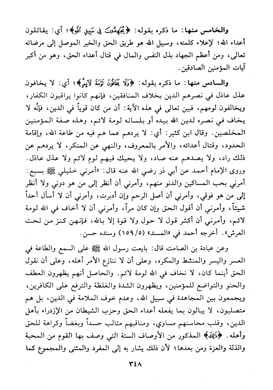والسادس منها: ما ذكره بقوله: {وَلَا يَخَافُونَ لَوْمَةَ لَائِمٍ}؛ أي: لا يخافون عذل عاذل في نصرهم الدين بخلاف المنافقين، فإنهم كانوا يراقبون الكفار، ويخالفون لومهم، فبين تعالى في هذه الآية: أن من كان قويًّا في الدين، فإنَّه لا يخاف في نصره لدين الله بيده أو بلسانه لومة لائم، وهذه صفة المؤمنين المخلصين. وقال ابن كثير: أي: لا يردهم عما هم فيه من طاعة الله، وإقامة الحدود، وقتال أعدائه، والأمر بالمعروف، والنهي عن المنكر، لا يردهم عن ذلك راد، ولا يصدهم عنه صاد، ولا يحيك فيهم لوم لائم ولا عذل عاذل. وروى الإِمام أحمد عن أبي ذر رضي الله عنه قال: "أمرني خليلي - صلى الله عليه وسلم - بسبع: أمرني بحب المساكين والدنو منهم، وأمرني أن أنظر إلى من هو دوني ولا أنظر إلى من هو فوقي، وأمرني أن أصل الرحم وإن أدبرت، وأمرني أن لا أسأل أحدًا شيئًا، وأمرني أن أقول الحق وإن كان مرًّا، وأمرني أن لا أخاف في الله لومة لائم، وأمرني أن أكثر قول لا حول ولا قوة إلا بالله، فإنهن كنز من تحت العرش". أخرجه أحمد في "المسند" (5/ 159) وسنده حسن.