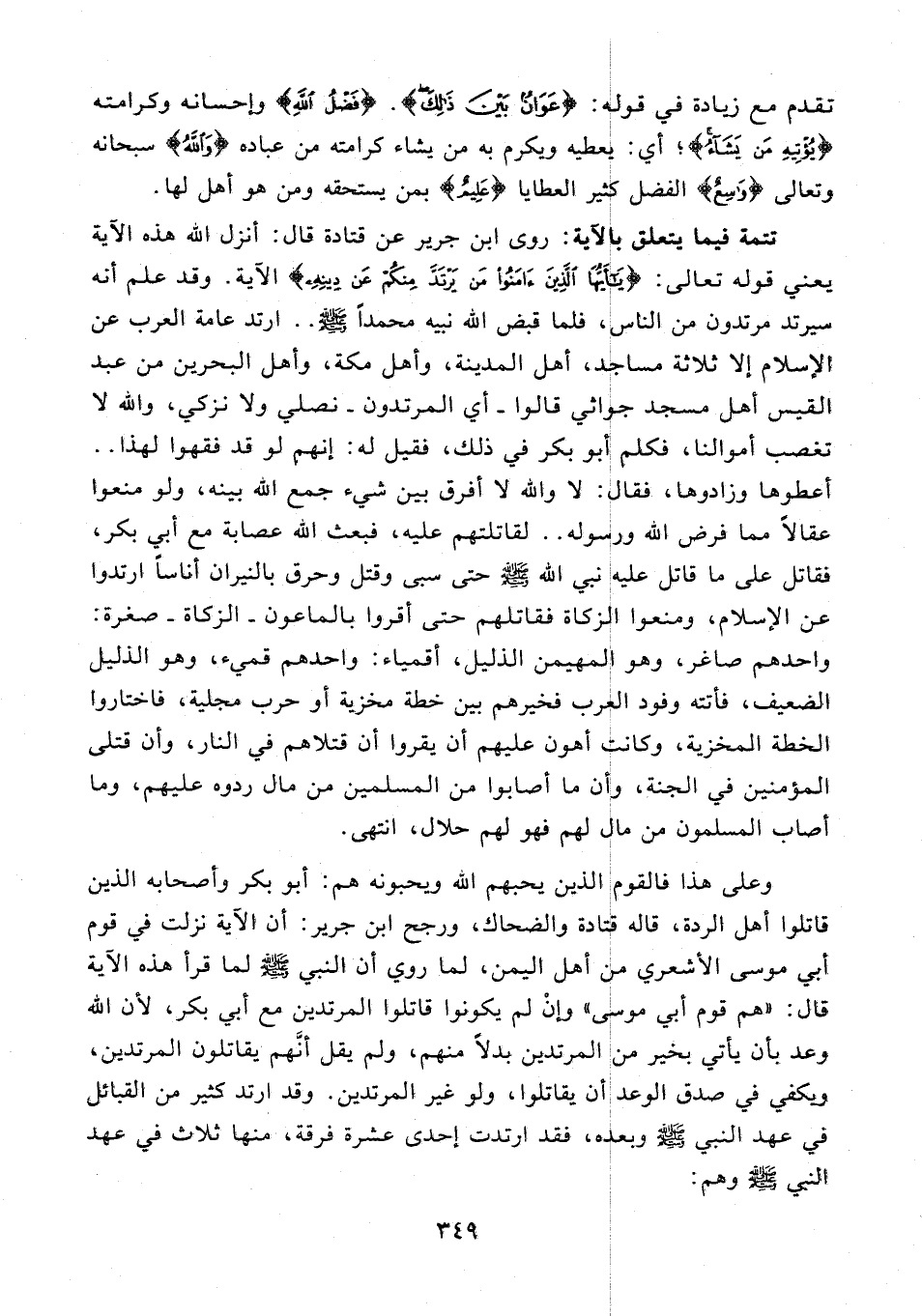 تتمة فيما يتعلق بالآية: روى ابن جرير عن قتادة قال: أنزل الله هذه الآية يعني قوله تعالى: {يَا أَيُّهَا الَّذِينَ آمَنُوا مَنْ يَرْتَدَّ مِنْكُمْ عَنْ دِينِهِ} الآية. وقد علم أنه سيرتد مرتدون من الناس، فلما قبض الله نبيه محمدًا - صلى الله عليه وسلم - .. ارتد عامة العرب عن الإسلام إلا ثلاثة مساجد، أهل المدينة، وأهل مكة، وأهل البحرين من عبد القيس أهل مسجد جواثي قالوا - أي المرتدون - نصلي ولا نزكي، والله لا تغصب أموالنا، فكلم أبو بكر في ذلك، فقيل له: إنهم لو قد فقهوا لهذا .. أعطوها وزادوها، فقال: لا والله لا أفرق بين شيء جمع الله بينه، ولو منعوا عقالًا مما فرض الله ووسوله .. لقاتلتهم عليه، فبعث الله عصابة مع أبي بكر، فقاتل على ما قاتل عليه نبي الله - صلى الله عليه وسلم - حتى سبى وقتل وحرق بالنيران أناسًا ارتدوا عن الإِسلام، ومنعوا الزكاة فقاتلهم حتى أقروا بالماعون - الزكاة - صغرة: واحدهم صاغر، وهو المهيمن الذليل، أقمياء: واحدهم قميء، وهو الذليل الضعيف، فأتته وفود العرب فخيرهم بين خطة مخزية أو حرب مجلية، فاختاروا الخطة المخزية، وكانت أهون عليهم أن يقروا أن قتلاهم في النار، وأن قتلى المؤمنين في الجنة، وأن ما أصابوا من المسلمين من مال ردوه عليهم، وما أصاب المسلمون من مال لهم فهو لهم حلال، انتهى.