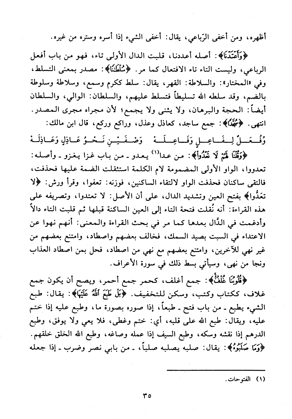 {وَأَعْتَدْنَا}: أصله أعددنا، قلبت الدال الأولى تاء، فهو من باب أفعل الرباعي، وليست التاء تاء الافتعال كما مر. {سُلْطَانًا}: مصدر بمعنى التسلط، وفي "المختار": والسلاطة: القهر، يقال: سلط ككرم وسمع، وسلاطة وسلوطة بالضم، وقد سلطه الله تسليطًا فتسلط عليهم، والسلطان: الوالي، والسلطان أيضًا: الحجة والبرهان، ولا يثنى ولا يجمع؛ لأن مجراه مجرى المصدر. انتهى. {سُجَّدًا}: جمع ساجد، كعادل وعدل، وراكع وركع، قال ابن مالك: