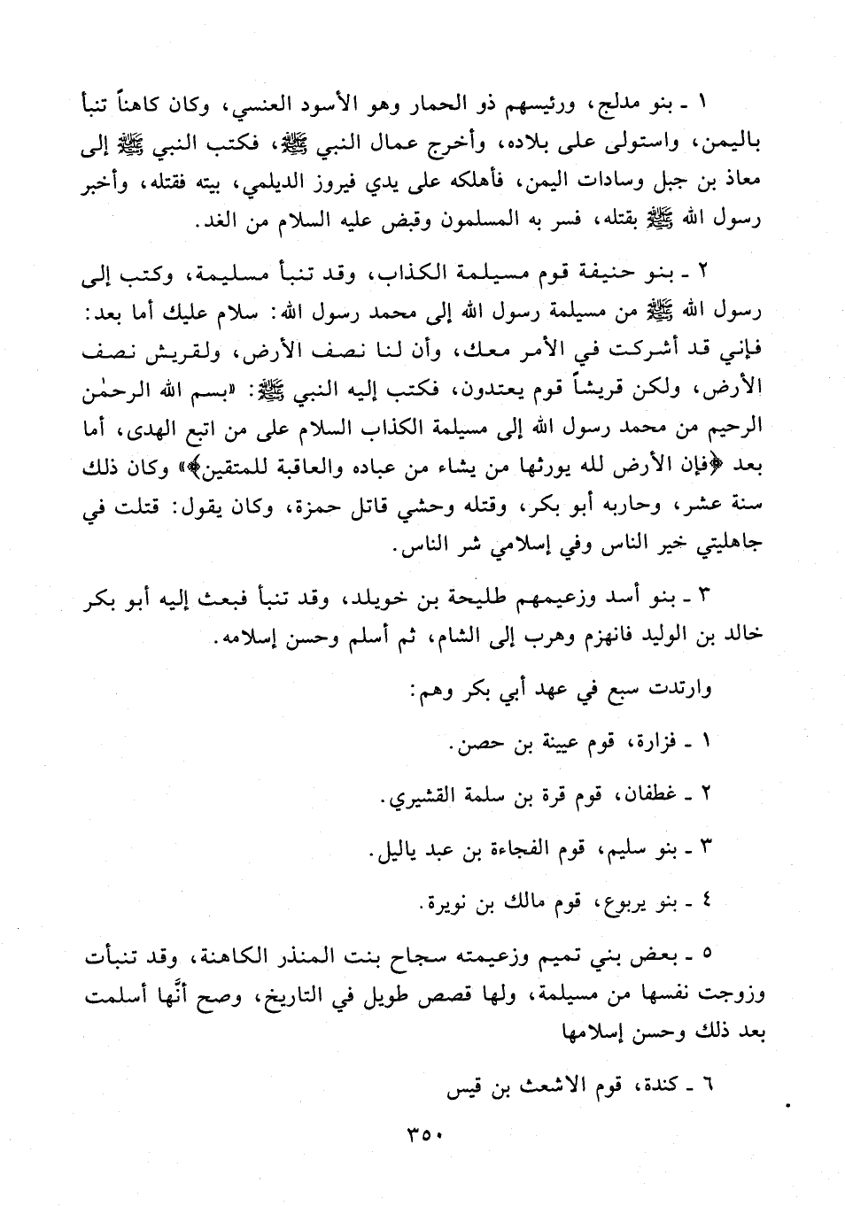 2 - بنو حنيفة قوم مسيلمة الكذاب، وقد تنبأ مسليمة، وكتب إلى رسول الله - صلى الله عليه وسلم - من مسيلمة رسول الله إلى محمد رسول الله: سلام عليك أما بعد: فإني قد أشركت في الأمر معك، وأن لنا نصف الأرض، ولقريش نصف الأرض، ولكن قريشًا قوم يعتدون، فكتب إليه النبي - صلى الله عليه وسلم -: "بِسْمِ اللَّهِ الرَّحْمَنِ الرَّحِيمِ من محمد رسول الله إلى مسيلمة الكذاب السلام على من اتبع الهدى، أما بعد {فإن الأرض لله يورثها من يشاء من عباده والعاقبة للمتقين} وكان ذلك سنة عشر، وحاربه أبو بكر، وقتله وحشي قاتل حمزة، وكان يقول: قتلت في جاهليتي خير الناس وفي إسلامي شر الناس.