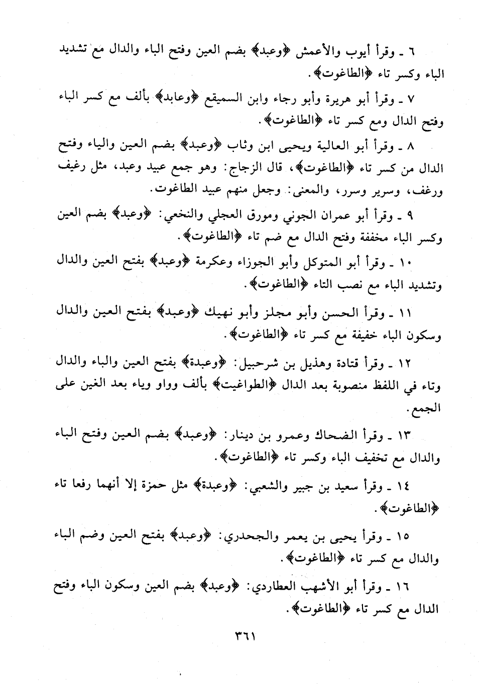 10 - وقرأ أبو المتوكل وأبو الجوزاء وعكرمة {وعبد} بفتح العين والدال وتشديد الباء مع نصب التاء {الطاغوت}.