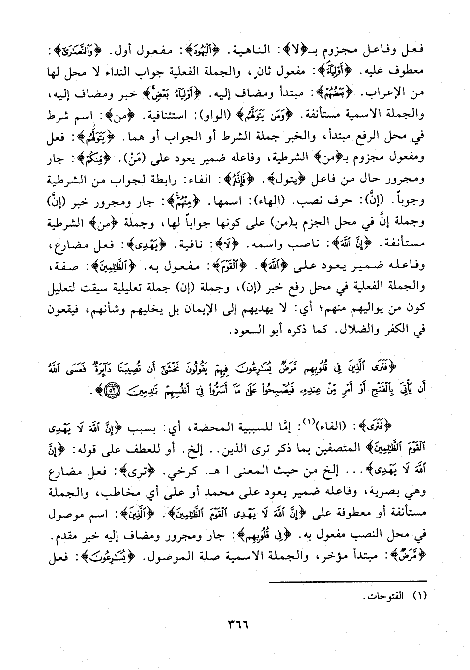 {فَتَرَى}: (الفاء) (¬1): إمَّا للسببية المحضة، أي: بسبب {إِنَّ اللَّهَ لَا يَهْدِي الْقَوْمَ الظَّالِمِينَ} المتصفين بما ذكر ترى الذين .. إلخ. أو للعطف على قوله: {إِنَّ اللَّهَ لَا يَهْدِي} ... إلخ من حيث المعنى اهـ. كرخي. {ترى}: فعل مضارع وهي بصرية، وفاعله ضمير يعود على محمد أو على أي مخاطب، والجملة مستأنفة أو معطوفة على {إِنَّ اللَّهَ لَا يَهْدِي الْقَوْمَ الظَّالِمِينَ}. {الَّذِينَ}: اسم موصول في محل النصب مفعول به. {فِي قُلُوبِهِمْ}: جار ومجرور ومضاف إليه خبر مقدم. {مَرَضٌ}: مبتدأ مؤخر، والجملة الإسمية صلة الموصول. {يُسَارِعُونَ}: فعل
