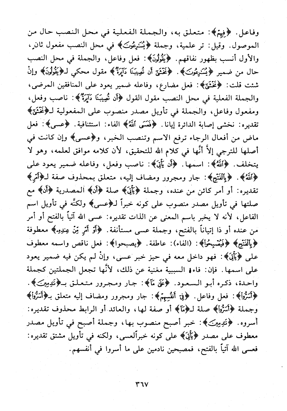 وفاعل. {فِيهِمْ}: متعلق به، والجملة الفعلية في محل النصب حال من الموصول. وقيل: تر علمية، وجملة {يُسَارِعُونَ} في محل النصب مفعول ثانٍ، والأول أنسب بظهور نفاقهم. {يَقُولُونَ}: فعل وفاعل، والجملة في محل النصب حال من ضمير {يُسَارِعُونَ}. {نَخْشَى أَنْ تُصِيبَنَا دَائِرَةٌ} مقول محكي لـ {يَقُولُونَ} وإنْ شئت قلت: {نَخْشَى}: فعل مضارع، وفاعله ضمير يعود على المنافقين المرضى، والجملة الفعلية في محل النصب مقول القول {نَخْشَى أَنْ تُصِيبَنَا دَائِرَةٌ}: ناصب وفعل، ومفعول وفاعل، والجملة في تأويل مصدر منصوب على المفعولية لـ {نَخْشَى} تقديره: نخشى إصابة الدائرة إيانا. {فَعَسَى اللَّهُ} الفاء: استئنافية. {عسى}: فعل ماض من أفعال الرجاء ترفع الاسم وتنصب الخبر، و {عسى} وإن كانت في أصلها للترجي إلّا أنَّها في كلام الله للتحقيق؛ لأن كلامه موافق لعلمه، وهو لا يتخلف. {اللَّهُ}: اسمها. {أَنْ يَأتِيَ}: ناصب وفعل، وفاعله ضمير يعود على {اللَّهُ}. {بِالْفَتْحِ}: جار ومجرور ومضاف إليه، متعلق بمحذوف صفة لـ {أَمْرٍ} تقديره: أو أمر كائن من عنده، وجملة {يَأتِيَ} صلة {أَن} المصدرية {أَن} مع صلتها في تأويل مصدر منصوب على كونه خبرًا لـ {عسى} ولكنَّه في تأويل اسم الفاعل؛ لأنه لا يخبر باسم المعنى عن الذات تقديره: عسى الله آتيًا بالفتح أو أمر من عنده أو ذا إتيانًا بالفتح، وجملة عسى مستأنفة. {أَوْ أَمْرٍ مِنْ عِنْدِهِ} معطوفة {بِالْفَتْحِ} {فَيُصْبِحُوا}: (الفاء): عاطفة. {يصبحوا}: فعل ناقص واسمه معطوف على {يَأتِيَ}: فهو داخل معه في حيز خبر عسى، وإنْ لم يكن فيه ضمير يعود على اسمها. فإن: فاء السببية مغنية عن ذلك، لأنها تجعل الجملتين كجملة واحدة، ذكره أبو السعود. {عَلَى مَا}: جار ومجرور متعلق بـ {نَادِمِينَ}. {أَسَرُّوا}: فعل وفاعل. {فِي أَنْفُسِهِمْ}: جار ومجرور ومضاف إليه متعلق بـ {أَسَرُّوا} وجملة {أَسَرُّوا} صلة لـ {مَا} أو صفة لها، والعائد. أو الرابط محذوف تقديره: أسروه. {نَادِمِينَ}: خبر أصبح منصوب بها، وجملة أصبح في تأويل مصدر معطوف على مصدر {يَأتِيَ} على كونه خبرًا لعسى، ولكنه في تأويل مشتق تقديره: فعسى الله آتيًا بالفتح، فمصبحين نادمين على ما أسروا في أنفسهم.