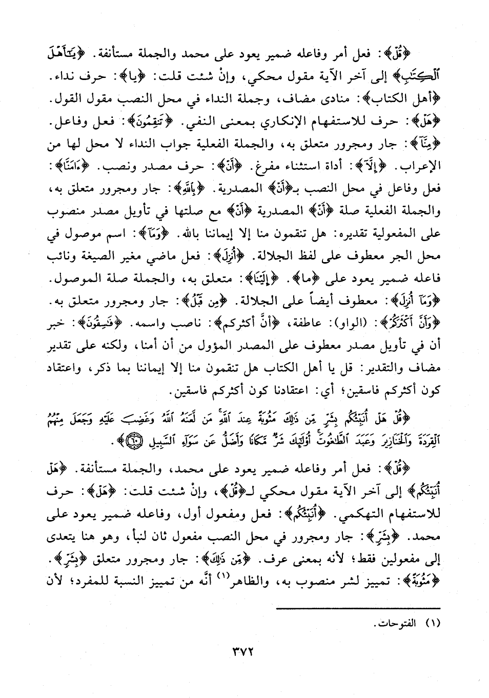 {قُلْ}: فعل أمر وفاعله ضمير يعود على محمَّد، والجملة مستأنفة. {هَلْ أُنَبِّئُكُمْ} إلى آخر الآية مقول محكي لـ {قُلْ}، وإنْ شئت قلت: {هَلْ}: حرف للاستفهام التهكمي. {أُنَبِّئُكُمْ}: فعل ومفعول أول، وفاعله ضمير يعود على محمَّد. {بِشَرٍّ}: جار ومجرور في محل النصب مفعول ثان لنبأ، وهو هنا يتعدى إلى مفعولين فقط؛ لأنه بمعنى عرف. {مِنْ ذَلِكَ}: جار ومجرور متعلق {بِشَرٍّ}. {مَثُوبَةً}: تمييز لشر منصوب به، والظاهر (¬1) أنَّه من تمييز النسبة للمفرد؛ لأن