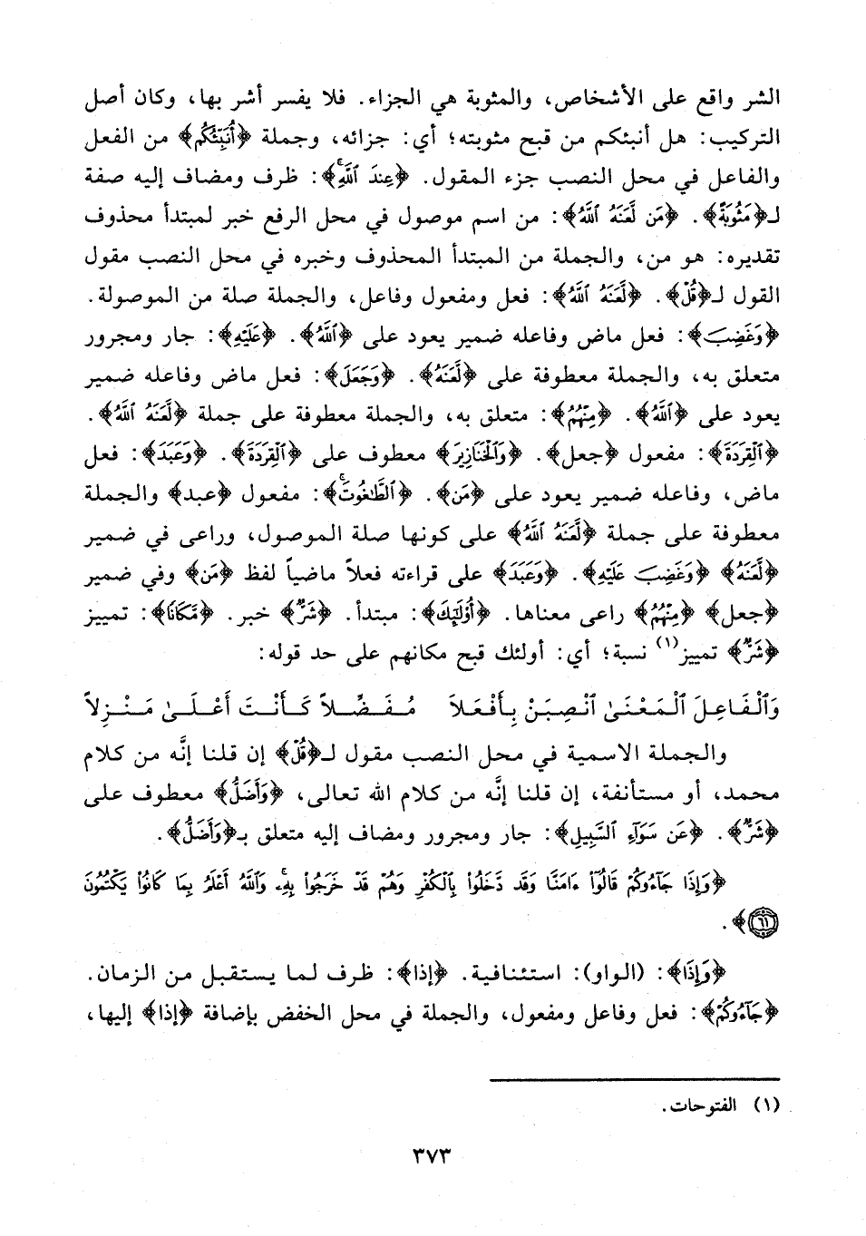الشر واقع على الأشخاص، والمثوبة هي الجزاء. فلا يفسر أشر بها، وكان أصل التركيب: هل أنبئكم من قبح مثوبته؛ أي: جزائه، وجملة {أُنَبِّئُكُمْ} من الفعل والفاعل في محل النصب جزء المقول. {عِنْدَ اللَّهِ}: ظرف ومضاف إليه صفة لـ {مَثُوبَةً}. {مَنْ لَعَنَهُ اللَّهُ}: من اسم موصول في محل الرفع خبر لمبتدأ محذوف تقديره: هو من، والجملة من المبتدأ المحذوف وخبره في محل النصب مقول القول لـ {قُلْ}. {لَعَنَهُ اللَّهُ}: فعل ومفعول وفاعل، والجملة صلة من الموصولة. {وَغَضِبَ}: فعل ماض وفاعله ضمير يعود على {اللَّهُ}. {عَلَيْهِ}: جار ومجرور متعلق به، والجملة معطوفة على {لَعَنَهُ}. {وَجَعَلَ}: فعل ماض وفاعله ضمير يعود على {اللَّهُ}. {مِنْهُمُ}: متعلق به، والجملة معطوفة على جملة {لَعَنَهُ اللَّهُ}. {الْقِرَدَةَ}: مفعول (جعل). {وَالْخَنَازِيرَ} معطوف على {الْقِرَدَةَ}. {وَعَبَدَ}: فعل ماض، وفاعله ضمير يعود على (مَن). {الطَّاغُوتَ}: مفعول (عبد) والجملة معطوفة على جملة {لَعَنَهُ اللَّهُ} على كونها صلة الموصول، وراعى في ضمير {لَعَنَهُ} {وَغَضِبَ عَلَيْهِ}. (وَعَبَدَ) على قراءته فعلًا ماضيًا لفظ (مَن) وفي ضمير {جعل} {منهُمُ} راعى معناها. {أُولَئِكَ}: مبتدأ. {شَرٌّ} خبر. {مَكَانًا}: تمييز {شَرٌّ} تمييز (¬1) نسبة؛ أي: أولئك قبح مكانهم على حد قوله:
