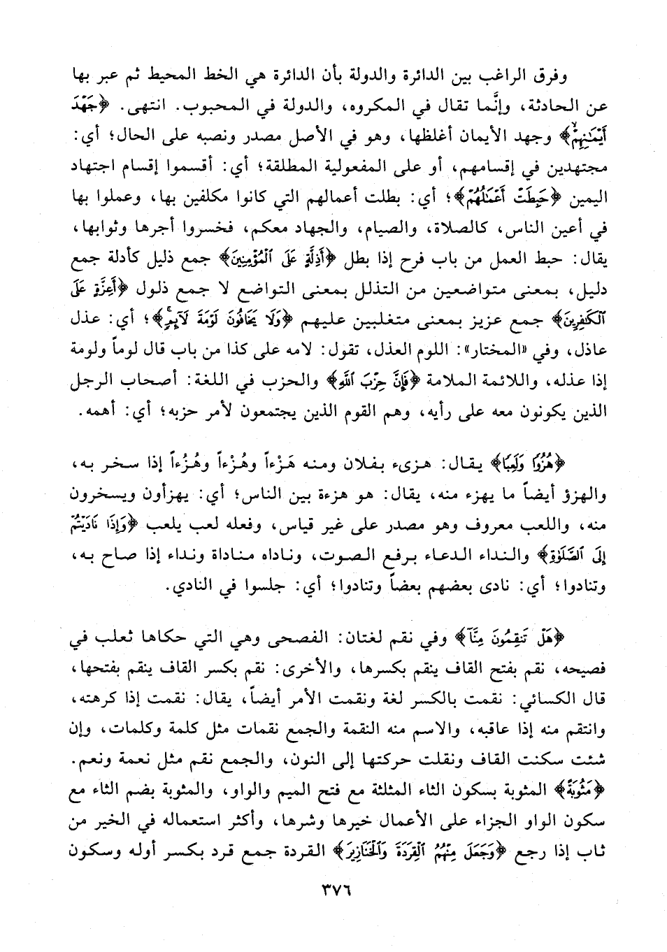 {هُزُوًا وَلَعِبًا} يقال: هزىء بفلان ومنه هَزْءًا وهُزْءًا وهُزُءًا إذا سخر به، والهزؤ أيضًا ما يهزء منه، يقال: هو هزءة بين الناس؛ أي: يهزأون ويسخرون منه، واللعب معروف وهو مصدر على غير قياس، وفعله لعب يلعب {وَإِذَا نَادَيْتُمْ إِلَى الصَّلَاةِ} والنداء الدعاء برفع الصوت، وناداه مناداة ونداء إذا صاح به، وتنادوا؛ أي: نادى بعضهم بعضًا وتنادوا؛ أي: جلسوا في النادي.