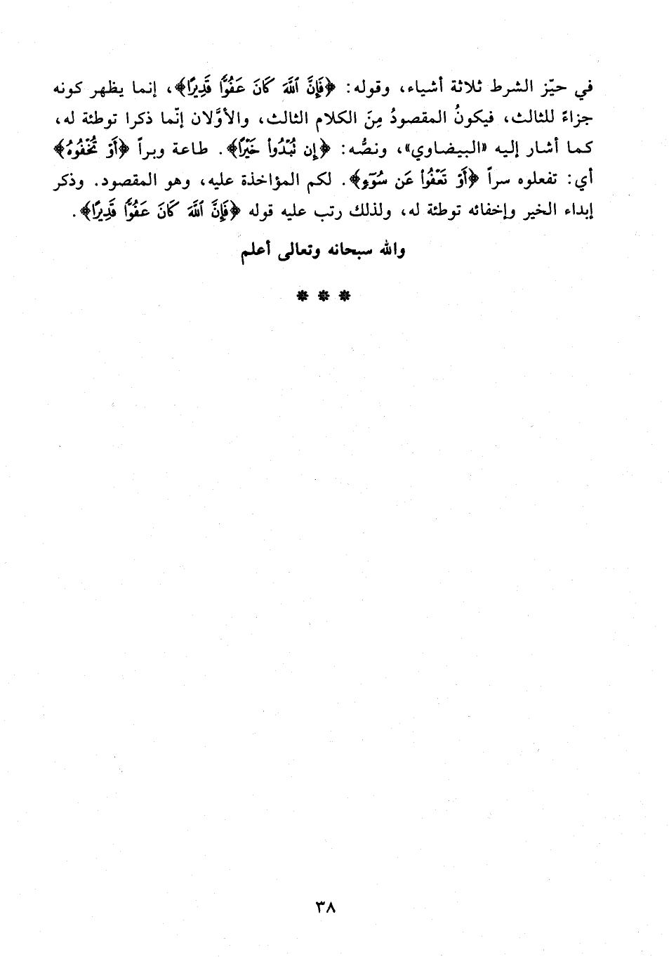 في حيّز الشرط ثلاثة أشياء، وقوله: {فَإِنَّ اللَّهَ كَانَ عَفُوًّا قَدِيرًا}، إنما يظهر كونه جزاءً للثالث، فيكونُ المقصودُ مِنَ الكلام الثالث، والأوَّلان إنما ذكرا توطئة له، كما أشار إليه "البيضاوي"، ونصُّه: {إِنْ تُبْدُوا خَيْرًا}. طاعة وبرًّا {أَوْ تُخْفُوهُ} أي: تفعلوه سرًّا {أَوْ تَعْفُوا عَنْ سُوءٍ}. لكم المؤاخذة عليه، وهو المقصود. وذكر إبداء الخير وإخفائه توطئة له، ولذلك رتب عليه قوله {فَإِنَّ اللَّهَ كَانَ عَفُوًّا قَدِيرًا}.