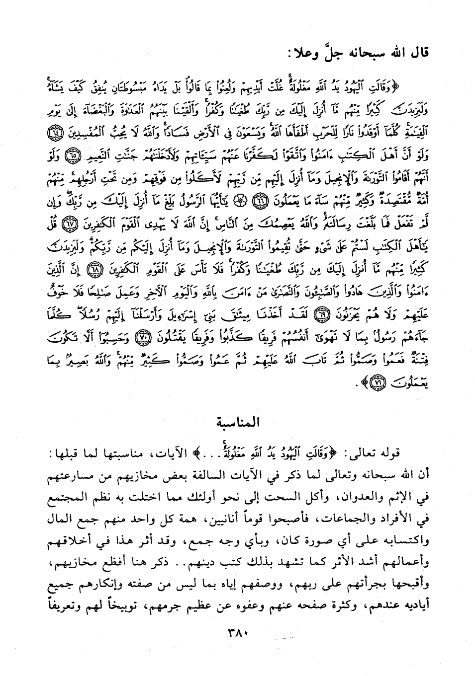{وَقَالَتِ الْيَهُودُ يَدُ اللَّهِ مَغْلُولَةٌ غُلَّتْ أَيْدِيهِمْ وَلُعِنُوا بِمَا قَالُوا بَلْ يَدَاهُ مَبْسُوطَتَانِ يُنْفِقُ كَيْفَ يَشَاءُ وَلَيَزِيدَنَّ كَثِيرًا مِنْهُمْ مَا أُنْزِلَ إِلَيْكَ مِنْ رَبِّكَ طُغْيَانًا وَكُفْرًا وَأَلْقَيْنَا بَيْنَهُمُ الْعَدَاوَةَ وَالْبَغْضَاءَ إِلَى يَوْمِ الْقِيَامَةِ كُلَّمَا أَوْقَدُوا نَارًا لِلْحَرْبِ أَطْفَأَهَا اللَّهُ وَيَسْعَوْنَ فِي الْأَرْضِ فَسَادًا وَاللَّهُ لَا يُحِبُّ الْمُفْسِدِينَ (64) وَلَوْ أَنَّ أَهْلَ الْكِتَابِ آمَنُوا وَاتَّقَوْا لَكَفَّرْنَا عَنْهُمْ سَيِّئَاتِهِمْ وَلَأَدْخَلْنَاهُمْ جَنَّاتِ النَّعِيمِ (65) وَلَوْ أَنَّهُمْ أَقَامُوا التَّوْرَاةَ وَالْإِنْجِيلَ وَمَا أُنْزِلَ إِلَيْهِمْ مِنْ رَبِّهِمْ لَأَكَلُوا مِنْ فَوْقِهِمْ وَمِنْ تَحْتِ أَرْجُلِهِمْ مِنْهُمْ أُمَّةٌ مُقْتَصِدَةٌ وَكَثِيرٌ مِنْهُمْ سَاءَ مَا يَعْمَلُونَ (66) يَا أَيُّهَا الرَّسُولُ بَلِّغْ مَا أُنْزِلَ إِلَيْكَ مِنْ رَبِّكَ وَإِنْ لَمْ تَفْعَلْ فَمَا بَلَّغْتَ رِسَالَتَهُ وَاللَّهُ يَعْصِمُكَ مِنَ النَّاسِ إِنَّ اللَّهَ لَا يَهْدِي الْقَوْمَ الْكَافِرِينَ (67) قُلْ يَا أَهْلَ الْكِتَابِ لَسْتُمْ عَلَى شَيْءٍ حَتَّى تُقِيمُوا التَّوْرَاةَ وَالْإِنْجِيلَ وَمَا أُنْزِلَ إِلَيْكُمْ مِنْ رَبِّكُمْ وَلَيَزِيدَنَّ كَثِيرًا مِنْهُمْ مَا أُنْزِلَ إِلَيْكَ مِنْ رَبِّكَ طُغْيَانًا وَكُفْرًا فَلَا تَأسَ عَلَى الْقَوْمِ الْكَافِرِينَ (68) إِنَّ الَّذِينَ آمَنُوا وَالَّذِينَ هَادُوا وَالصَّابِئُونَ وَالنَّصَارَى مَنْ آمَنَ بِاللَّهِ وَالْيَوْمِ الْآخِرِ وَعَمِلَ صَالِحًا فَلَا خَوْفٌ عَلَيْهِمْ وَلَا هُمْ يَحْزَنُونَ (69) لَقَدْ أَخَذْنَا مِيثَاقَ بَنِي إِسْرَائِيلَ وَأَرْسَلْنَا إِلَيْهِمْ رُسُلًا كُلَّمَا جَاءَهُمْ رَسُولٌ بِمَا لَا تَهْوَى أَنْفُسُهُمْ فَرِيقًا كَذَّبُوا وَفَرِيقًا يَقْتُلُونَ (70) وَحَسِبُوا أَلَّا تَكُونَ فِتْنَةٌ فَعَمُوا وَصَمُّوا ثُمَّ تَابَ اللَّهُ عَلَيْهِمْ ثُمَّ عَمُوا وَصَمُّوا كَثِيرٌ مِنْهُمْ وَاللَّهُ بَصِيرٌ بِمَا يَعْمَلُونَ (71)}.
