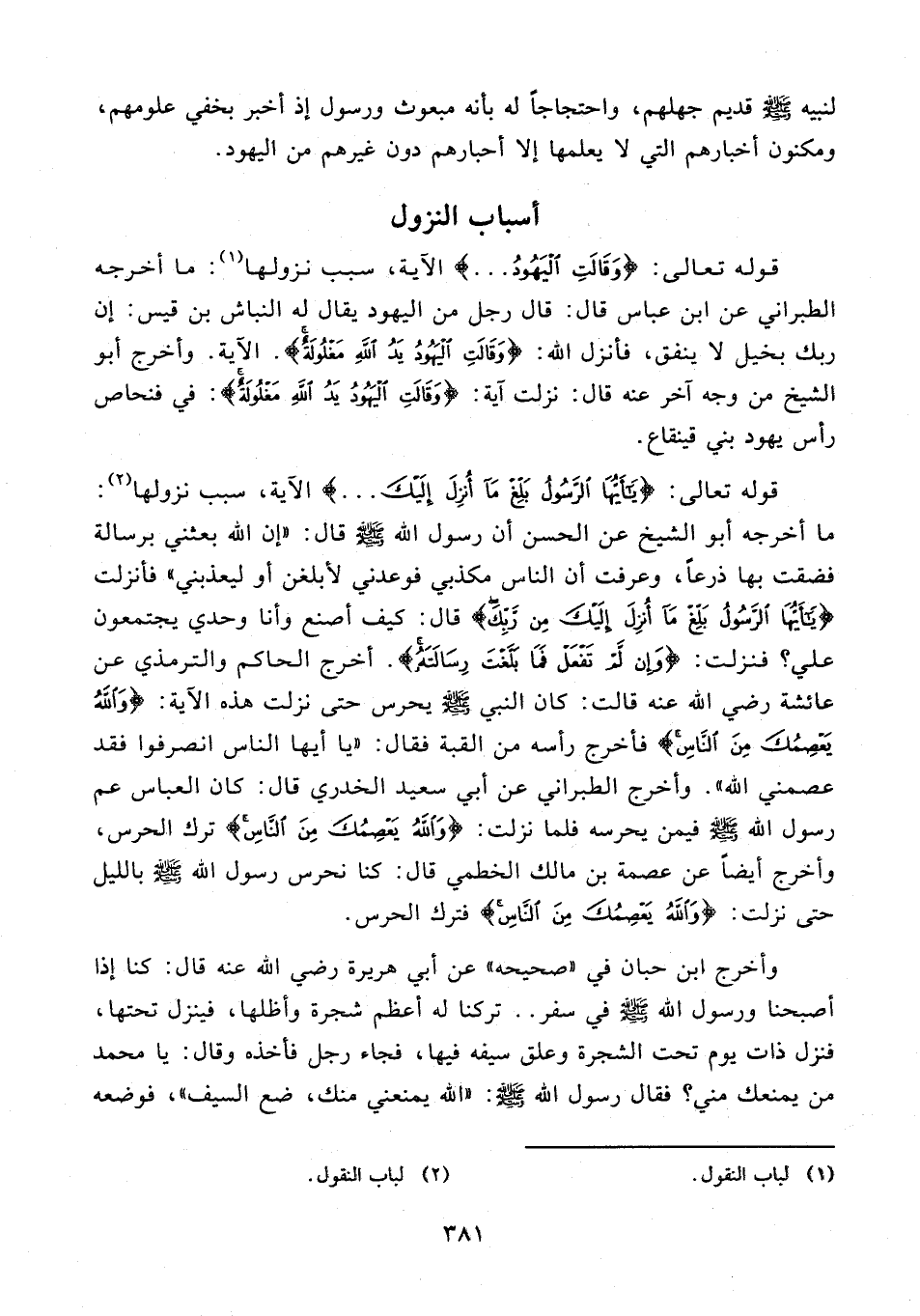 قوله تعالى: {يَا أَيُّهَا الرَّسُولُ بَلِّغْ مَا أُنْزِلَ إِلَيْكَ ...} الآية، سبب نزولها (¬2): ما أخرجه أبو الشيخ عن الحسن أن رسول الله - صلى الله عليه وسلم - قال: "إن الله بعثني برسالة فضقت بها ذرعًا، وعرفت أن الناس مكذبي فوعدني لأبلغن أو ليعذبني" فأنزلت {يَا أَيُّهَا الرَّسُولُ بَلِّغْ مَا أُنْزِلَ إِلَيْكَ} قال: كيف أصنع وأنا وحدي يجتمعون علي؟ فنزلت: {وَإِنْ لَمْ تَفْعَلْ فَمَا بَلَّغْتَ رِسَالَتَهُ}. أخرج الحاكم والترمذي عن عائشة رضي الله عنه قالت: كان النبي - صلى الله عليه وسلم - يحرس حتى نزلت هذه الآية: {وَاللَّهُ يَعْصِمُكَ مِنَ النَّاسِ} فأخرج رأسه من القبة فقال: "يا أيها الناس انصرفوا فقد عصمني الله". وأخرج الطبراني عن أبي سعيد الخدري قال: كان العباس عم رسول الله - صلى الله عليه وسلم - فيمن يحرسه فلما نزلت: {وَاللَّهُ يَعْصِمُكَ مِنَ النَّاسِ} فترك الحرس, وأخرج أيضًا عن عصمة بن مالك الخطمي قال: كنا نحرس رسول الله - صلى الله عليه وسلم - بالليل حتى نزلت: {وَاللَّهُ يَعْصِمُكَ مِنَ النَّاسِ} فترك الحرس.