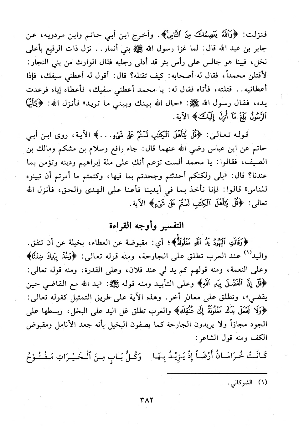 فنزلت: {وَاللَّهُ يَعْصِمُكَ مِنَ النَّاسِ}. وأخرج ابن أبي حاتم وابن مردويه، عن جابر بن عبد الله قال: لما غزا رسول الله - صلى الله عليه وسلم - بني أنمار .. نزل ذات الرقيع بأعلى نخل، فبينا هو جالس على رأس بئر قد أدلى رجليه فقال الوارث من بني النجار: لأقتلن محمدًا، فقال له أصحابه: كيف تقتله؟ قال: أقول له أعطني سيفك، فإذا أعطانيه .. قتلته، فأتاه فقال له: يا محمَّد أعطني سفيك، فأعطاه إياه فرعدت يده، فقال رسول الله - صلى الله عليه وسلم -: "حال الله بينك وبيني ما تريد" فأنزل الله: {يَا أَيُّهَا الرَّسُولُ بَلِّغْ مَا أُنْزِلَ إِلَيْكَ} الآية.