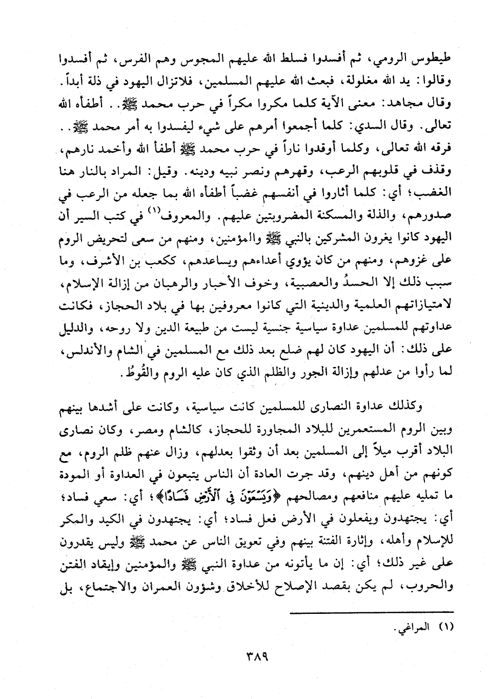 وكذلك عداوة النصارى للمسلمين كانت سياسية، وكانت على أشدها بينهم وبين الروم المستعمرين للبلاد المجاورة للحجاز، كالشام ومصر، وكان نصارى البلاد أقرب ميلًا إلى المسلمين بعد أن وثقوا بعدلهم، وزال عنهم ظلم الروم، مع كونهم من أهل دينهم، وقد جرت العادة أن الناس يتبعون في العداوة أو المودة ما تمليه عليهم منافعهم ومصالحهم {وَيَسْعَوْنَ فِي الْأَرْضِ فَسَادًا}؛ أي: سعي فساد؛ أي: يجتهدون ويفعلون في الأرض فعل فساد؛ أي: يجتهدون في الكيد والمكر للإسلام وأهله، وإثارة الفتنة بينهم وفي تعويق الناس عن محمَّد - صلى الله عليه وسلم - وليس يقدرون على غير ذلك؛ أي: إن ما يأتونه من عداوة النبي - صلى الله عليه وسلم - والمؤمنين وإيقاد الفتن والحروب، لم يكن بقصد الإصلاح للأخلاق وشؤون العمران والاجتماع، بل