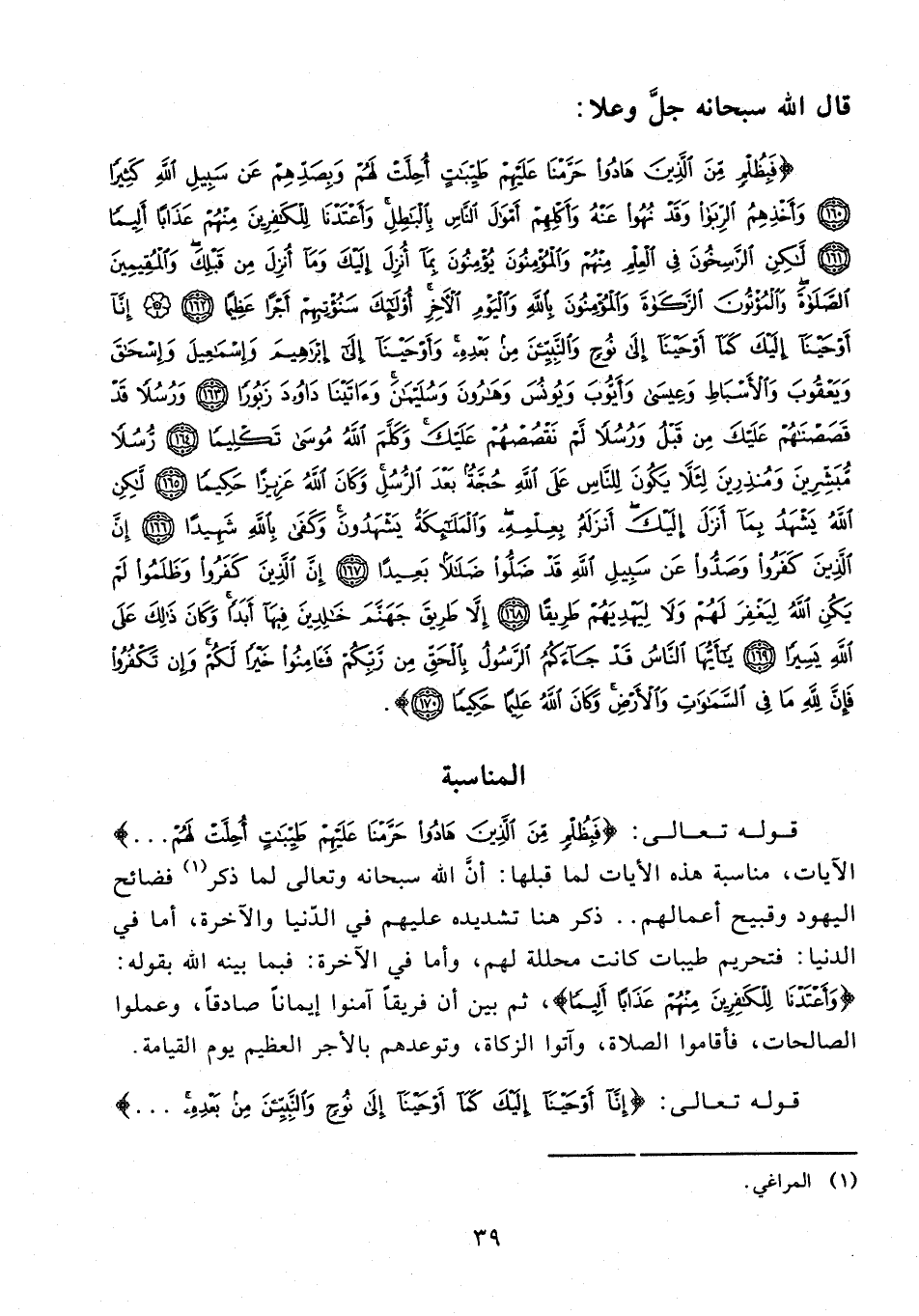 {فَبِظُلْمٍ مِنَ الَّذِينَ هَادُوا حَرَّمْنَا عَلَيْهِمْ طَيِّبَاتٍ أُحِلَّتْ لَهُمْ وَبِصَدِّهِمْ عَنْ سَبِيلِ اللَّهِ كَثِيرًا (160) وَأَخْذِهِمُ الرِّبَا وَقَدْ نُهُوا عَنْهُ وَأَكْلِهِمْ أَمْوَالَ النَّاسِ بِالْبَاطِلِ وَأَعْتَدْنَا لِلْكَافِرِينَ مِنْهُمْ عَذَابًا أَلِيمًا (161) لَكِنِ الرَّاسِخُونَ فِي الْعِلْمِ مِنْهُمْ وَالْمُؤْمِنُونَ يُؤْمِنُونَ بِمَا أُنْزِلَ إِلَيْكَ وَمَا أُنْزِلَ مِنْ قَبْلِكَ وَالْمُقِيمِينَ الصَّلَاةَ وَالْمُؤْتُونَ الزَّكَاةَ وَالْمُؤْمِنُونَ بِاللَّهِ وَالْيَوْمِ الْآخِرِ أُولَئِكَ سَنُؤْتِيهِمْ أَجْرًا عَظِيمًا (162) إِنَّا أَوْحَيْنَا إِلَيْكَ كَمَا أَوْحَيْنَا إِلَى نُوحٍ وَالنَّبِيِّينَ مِنْ بَعْدِهِ وَأَوْحَيْنَا إِلَى إِبْرَاهِيمَ وَإِسْمَاعِيلَ وَإِسْحَاقَ وَيَعْقُوبَ وَالْأَسْبَاطِ وَعِيسَى وَأَيُّوبَ وَيُونُسَ وَهَارُونَ وَسُلَيْمَانَ وَآتَيْنَا دَاوُودَ زَبُورًا (163) وَرُسُلًا قَدْ قَصَصْنَاهُمْ عَلَيْكَ مِنْ قَبْلُ وَرُسُلًا لَمْ نَقْصُصْهُمْ عَلَيْكَ وَكَلَّمَ اللَّهُ مُوسَى تَكْلِيمًا (164) رُسُلًا مُبَشِّرِينَ وَمُنْذِرِينَ لِئَلَّا يَكُونَ لِلنَّاسِ عَلَى اللَّهِ حُجَّةٌ بَعْدَ الرُّسُلِ وَكَانَ اللَّهُ عَزِيزًا حَكِيمًا (165) لَكِنِ اللَّهُ يَشْهَدُ بِمَا أَنْزَلَ إِلَيْكَ أَنْزَلَهُ بِعِلْمِهِ وَالْمَلَائِكَةُ يَشْهَدُونَ وَكَفَى بِاللَّهِ شَهِيدًا (166) إِنَّ الَّذِينَ كَفَرُوا وَصَدُّوا عَنْ سَبِيلِ اللَّهِ قَدْ ضَلُّوا ضَلَالًا بَعِيدًا (167) إِنَّ الَّذِينَ كَفَرُوا وَظَلَمُوا لَمْ يَكُنِ اللَّهُ لِيَغْفِرَ لَهُمْ وَلَا لِيَهْدِيَهُمْ طَرِيقًا (168) إِلَّا طَرِيقَ جَهَنَّمَ خَالِدِينَ فِيهَا أَبَدًا وَكَانَ ذَلِكَ عَلَى اللَّهِ يَسِيرًا (169) يَا أَيُّهَا النَّاسُ قَدْ جَاءَكُمُ الرَّسُولُ بِالْحَقِّ مِنْ رَبِّكُمْ فَآمِنُوا خَيْرًا لَكُمْ وَإِنْ تَكْفُرُوا فَإِنَّ لِلَّهِ مَا فِي السَّمَاوَاتِ وَالْأَرْضِ وَكَانَ اللَّهُ عَلِيمًا حَكِيمًا (170)}.