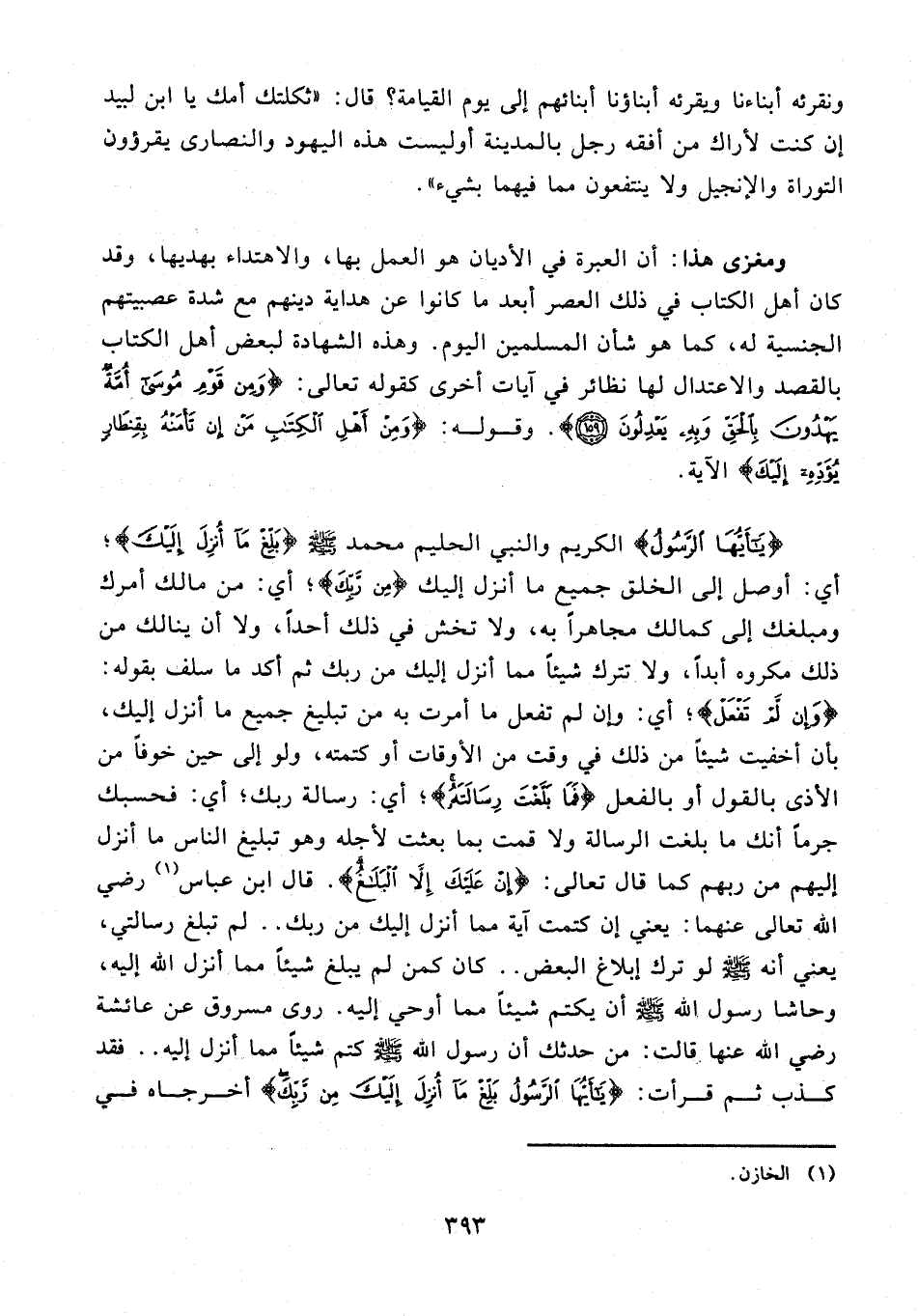 67 - {يَا أَيُّهَا الرَّسُولُ} الكريم والنبي الحليم محمد - صلى الله عليه وسلم - {بَلِّغْ مَا أُنْزِلَ إِلَيْكَ}؛ أي: أوصل إلى الخلق جميع ما أنزل إليك {مِنْ رَبِّكَ}؛ أي: من مالك أمرك ومبلغك إلى كمالك مجاهرًا به، ولا تخش في ذلك أحدًا، ولا أن ينالك من ذلك مكروه أبدًا، ولا تترك شيئًا مما أنزل إليك من ربك ثم أكد ما سلف بقوله: {وَإِنْ لَمْ تَفْعَلْ}؛ أي: وإن لم تفعل ما أمرت به من تبليغ جميع ما أنزل إليك، بأن أخفيت شيئًا من ذلك في وقت من الأوقات أو كتمته، ولو إلى حين خوفًا من الأذى بالقول أو بالفعل {فَمَا بَلَّغْتَ رِسَالَتَهُ}؛ أي: رسالة ربك؛ أي: فحسبك جرمًا أنك ما بلغت الرسالة ولا قمت بما بعثت لأجله وهو تبليغ الناس ما أنزل إليهم من ربهم كما قال تعالى: {إِنْ عَلَيْكَ إِلَّا الْبَلَاغُ}. قال ابن عباس (¬1) رضي الله تعالى عنهما: يعني إن كتمت آية مما أنزل إليك من ربك .. لم تبلغ رسالتي، يعني أنه - صلى الله عليه وسلم - لو ترك إبلاغ البعض .. كان كمن لم يبلغ شيئًا مما أنزل الله إليه، وحاشا رسول الله - صلى الله عليه وسلم - أن يكتم شيئًا مما أوحي إليه. روى مسروق عن عائشة رضي الله عنها. قالت: من حدثك أن رسول الله - صلى الله عليه وسلم - كتم شيئًا مما أنزل إليه .. فقد كذب ثم قرأت: {يَا أَيُّهَا الرَّسُولُ بَلِّغْ مَا أُنْزِلَ إِلَيْكَ مِنْ رَبِّكَ} أخرجاه في