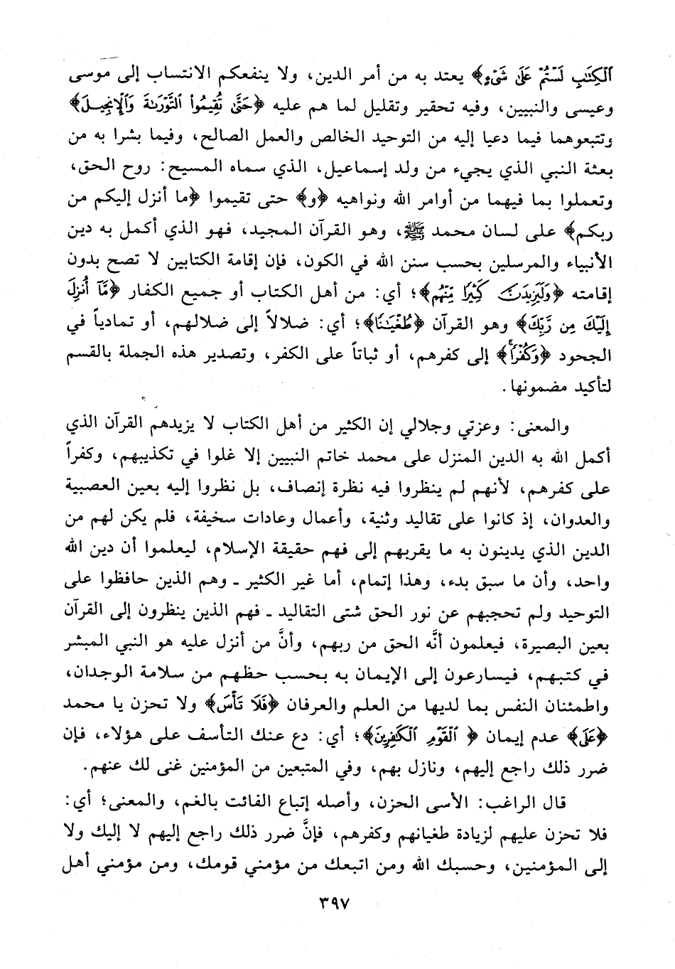 والمعنى: وعزتي وجلالي إن الكثير من أهل الكتاب لا يزيدهم القرآن الذي أكمل الله به الدين المنزل على محمَّد خاتم النبيين إلا غلوا في تكذيبهم، وكفرًا على كفرهم, لأنهم لم ينظروا فيه نظرة إنصاف، بل نظروا إليه بعين العصبية والعدوان، إذ كانوا على تقاليد وثنية، وأعمال وعادات سخيفة، فلم يكن لهم من الدين الذي يدينون به ما يقريهم إلى فهم حقيقة الإِسلام، ليعلموا أن دين الله واحد، وأن ما سبق بدء، وهذا إتمام، أما غير الكثير - وهم الذين حافظوا على التوحيد ولم تحجبهم عن نور الحق شتى التقاليد - فهم الذين ينظرون إلى القرآن بعين البصيرة، فيعلمون أنَّه الحق من ربهم، وأنَّ من أنزل عليه هو النبي المبشر في كتبهم، فيسارعون إلى الإيمان به بحسب حظهم من سلامة الوجدان، واطمئنان النفس بما لديها من العلم والعرفان {فَلَا تَأسَ} ولا تحزن يا محمَّد {عَلَى} عدم إيمان {الْقَوْمِ الْكَافِرِينَ}؛ أي: دع عنك التأسف على هؤلاء، فإن ضرر ذلك راجع إليهم، ونازل بهم، وفي المتبعين من المؤمنين غنى لك عنهم.