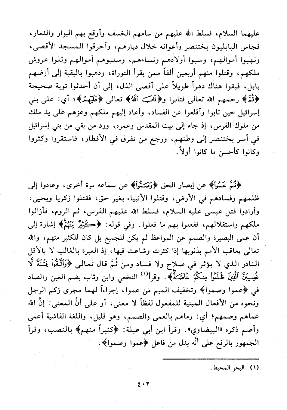 {ثُمَّ عَمُوا} عن إبصار الحق {وَصَمُّوا} عن سماعه مرة أخرى، وعادوا إلى ظلمهم وفسادهم في الأرض، وقتلوا الأنبياء بغير حق، فقتلوا زكريا ويحيى، وأرادوا قتل عيسى عليه السلام، فسلط الله عليهم الفرس، ثم الروم، فأزالوا ملكهم واستقلالهم، ففعلوا بهم ما فعلوا. وفي قوله: {كَثِيرٌ مِنْهُمْ} إشارة إلى أن عمى البصيرة والصمم عن المواعظ لم يكن للجميع بل كان للكثير منهم، والله تعالى يعاقب الأمم بذنوبها إذا كثرت وشاعت فيها، إذ العبرة بالغالب لا بالأقل النادر الذي لا يؤثر في صلاح ولا فساد ومن ثُمّ قال تعالى {وَاتَّقُوا فِتْنَةً لَا تُصِيبَنَّ الَّذِينَ ظَلَمُوا مِنْكُمْ خَاصَّةً}. وقرأ (¬1) النخعي وابن وثاب بضم العين والصاد في (عموا وصموا) وتخفيف الميم من عموا، إجراءًا لهما مجرى زكم الرجل ونحوه من الأفعال المبنية للمفعول لفظًا لا معنى، أو على أنَّ المعنى: إنَّ الله عماهم وصمهم؛ أي: رماهم بالعمى والصمم، وهو قليل، واللغة الفاشية أعمى وأصم ذكره "البيضاوي". وقرأ ابن أبي عبلة: (كثيرًا منهم) بالنصب، وقرأ الجمهور بالرفع على أنَّه بدل من فاعل (عموا وصموا).
