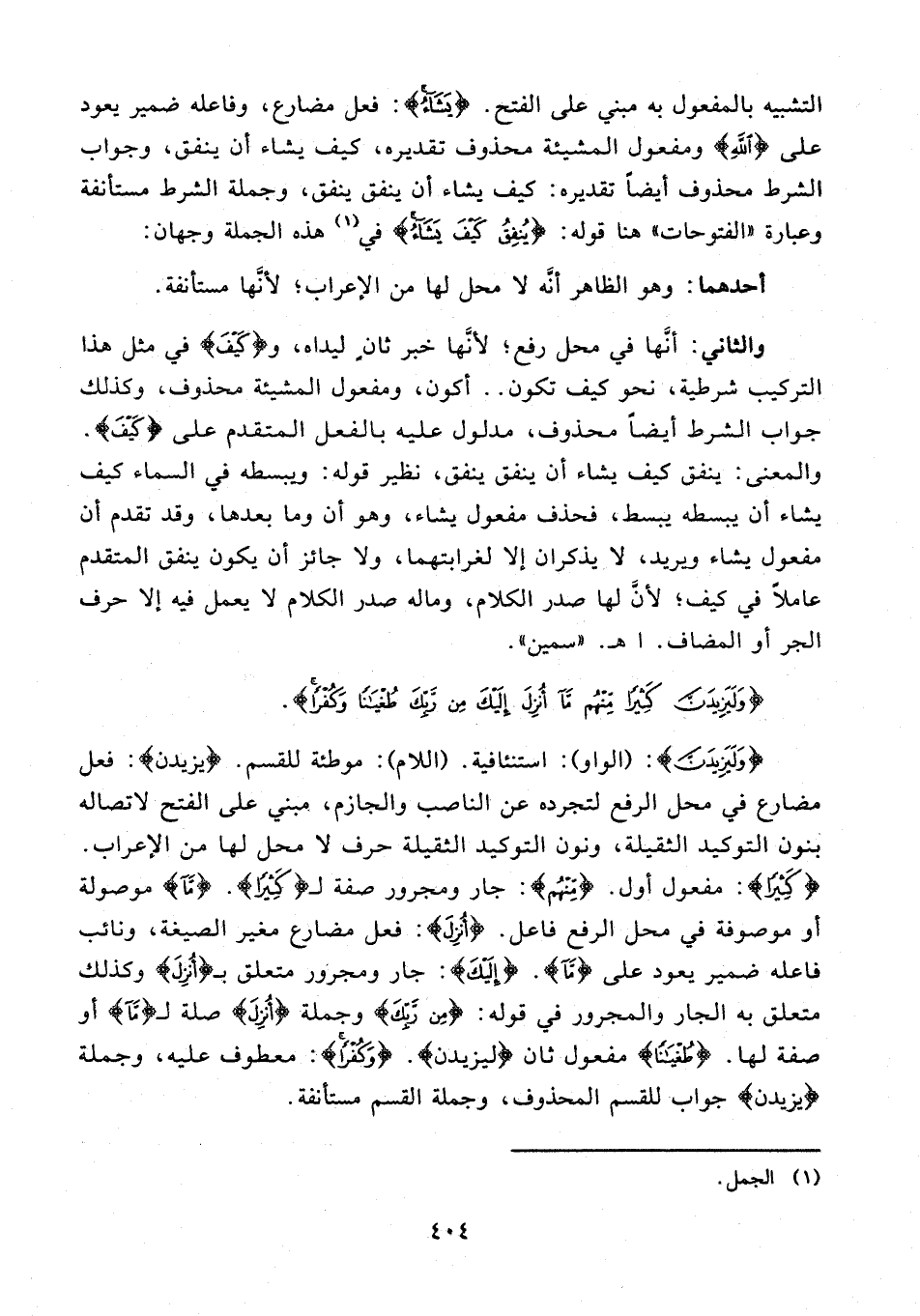 التشبيه بالمفعول به مبني على الفتح. {يَشَاءُ}: فعل مضارع، وفاعله ضمير يعود على {اللَّهِ} ومفعول المشيئة محذوف تقديره، كيف يشاء أن ينفق، وجواب الشرط محذوف أيضًا تقديره: كيف يشاء أن ينفق ينفق، وجملة الشرط مستأنفة وعبارة "الفتوحات" هنا قوله: {يُنْفِقُ كَيْفَ يَشَاءُ} في (¬1) هذه الجملة وجهان: