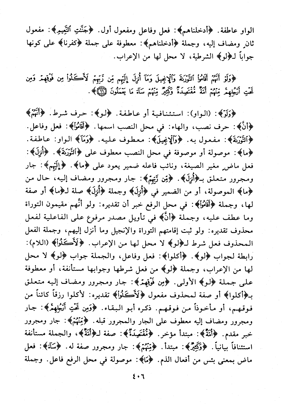 {وَلَوْ}: (الواو): استئنافية أو عاطفة. (لو): حرف شرط. {أَنَّهُمْ} (أنَّ): حرف نصب، والهاء: في محل النصب اسمها. {أَقَامُوا}: فعل وفاعل. {التَّوْرَاةَ}: مفعول به. {وَالْإِنْجِيلَ}: معطوف عليه. {وَمَا} الواو: عاطفة. (ما): موصولة أو موصوفة في محل النصب معطوف على {التَّوْرَاةَ}. {أُنْزِلَ}: فعل ماضٍ مغير الصيغة، ونائب فاعله ضمير يعود على (ما). {إِلَيْهِمْ}: جار ومجرور متعلق بـ {أُنْزِلَ}. {مِنْ رَبِّهِمْ}: جار ومجرور ومضاف إليه، حال من (ما) الموصولة، أو من الضمير في {أُنْزِلَ} وجملة (أُنزِلَ) صلة لـ (ما) أو صفة لها، وجملة {أَقَامُوا}: في محل الرفع خبر أن تقديره: ولو أنَّهم مقيمون التوراة وما عطف عليه، وجملة (أنَّ) في تأويل مصدر مرفوع على الفاعلية لفعل محذوف تقديره: ولو ثبت إقامتهم التوراة والإنجيل وما أنزل إليهم، وجملة الفعل المحذوف فعل شرط لـ (لو) لا محل لها من الإعراب. {لَأَكَلُوا} (اللام): رابطة لجواب (لو). (أكلوا): فعل وفاعل، والجملة جواب (لو) لا محل لها من الإعراب، وجملة (لو) من فعل شرطها وجوابها مستأنفة، أو معطوفة على جملة (لو) الأولى. {مِنْ فَوْقِهِمْ}: جار ومجرور ومضاف إليه متعلق بـ (أكلوا) أو صفة لمحذوف مفعول {لَأَكَلُوا} تقديره: لأكلوا رزقًا كائنًا من فوقهم، أو مأخوذًا من فوقهم. ذكره أبو البقاء. {وَمِنْ تَحْتِ أَرْجُلِهِمْ}: جار ومجرور ومضاف إليه معطوف على الجار والمجرور قبله. {مِنْهُمْ}: جار ومجرور خبر مقدم. {أُمَّة}: مبتدأ مؤخر. {مُقْتَصِدَةٌ}: صفة لـ {أُمَّةٌ}، والجملة مستأنفة استئنافًا بيانيًّا. {وَكَثِيرٌ}: مبتدأ. {مِنْهُمْ}: جار ومجرور صفة له. {سَاءَ}: فعل ماض بمعنى بئس من أفعال الذم. {مَا}: موصولة في محل الرفع فاعل. وجملة