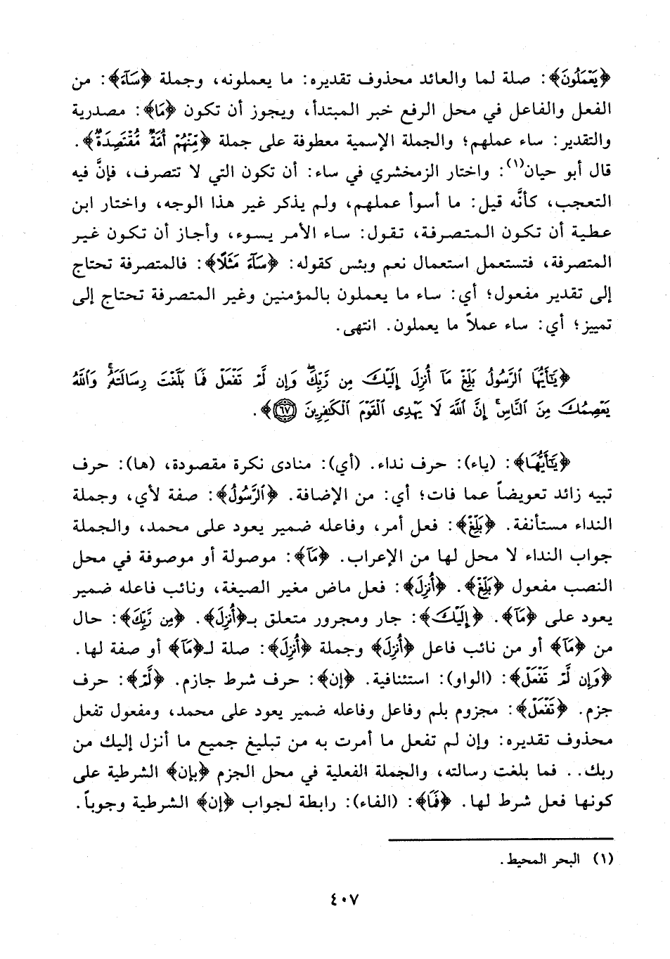 {يَا أَيُّهَا}: (ياء): حرف نداء. (أي): منادى نكرة مقصودة، (ها): حرف تنبيه زائد تعويضًا عما فات؛ أي: من الإضافة. {الرَّسُولُ}: صفة لأي، وجملة النداء مستأنفة. {بَلِّغْ}: فعل أمر، وفاعله ضمير يعود على محمَّد، والجملة جواب النداء لا محل لها من الإعراب. {مَا}: موصولة أو موصوفة في محل النصب مفعول {بَلِّغْ}. {أُنْزِلَ}: فعل ماض مغير الصيغة، ونائب فاعله ضمير يعود على {مَا}. {إِلَيْكَ}: جار ومجرور متعلق بـ {أُنْزِلَ}. {مِنْ رَبِّكَ}: حال من {مَا} أو من نائب فاعل {أُنْزِلَ} وجملة {أُنْزِلَ}: صلة لـ {مَا} أو صفة لها. {وَإِنْ لَمْ تَفْعَلْ}: (الواو): استئنافية. (إن): حرف شرط جازم. {لَم}: حرف جزم. {تَفْعَلْ}: مجزوم بلم وفاعل وفاعله ضمير يعود على محمَّد، ومفعول تفعل محذوف تقديره: وإن لم تفعل ما أمرت به من تبليغ جميع ما أنزل إليك من ربك .. فما بلغت رسالته، والجملة الفعلية في محل الجزم {بإن} الشرطية على كونها فعل شرط لها. {فَمَا}: (الفاء): رابطة لجواب (إن) الشرطية وجوبًا.