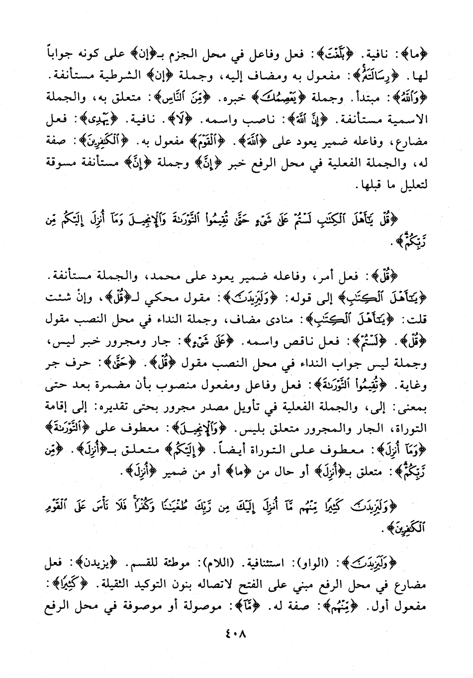 {قُلْ}: فعل أمر، وفاعله ضمير يعود على محمَّد، والجملة مستأنفة. {يَا أَهْلَ الْكِتَابِ} إلى قوله: {وَلَيَزِيدَنَّ}: مقول محكي لـ {قُلْ}، وإنْ شئت قلت: {يَا أَهْلَ الْكِتَابِ}: منادى مضاف، وجملة النداء في محل النصب مقول {قُلْ}. {لَسْتُمْ}: فعل ناقص واسمه. {عَلَى شَيْءٍ}: جار ومجرور خبر ليس، وجملة ليس جواب النداء في محل النصب مقول {قُلْ}. {حَتَّى}: حرف جر وغاية. {تُقِيمُوا التَّوْرَاةَ}: فعل وفاعل ومفعول منصوب بأن مضمرة بعد حتى بمعنى: إلى، والجملة الفعلية في تأويل مصدر مجرور بحتى تقديره: إلى إقامة التوراة، الجار والمجرور متعلق بليس. {وَالْإِنْجِيلَ}: معطوف على {التَّوْرَاةَ} {وَمَا أُنْزِلَ}: معطوف على التوراة أيضًا. {إِلَيْكُمْ} متعلق بـ {أُنْزِلَ}. {مِنْ رَبِّكُمْ}: متعلق بـ {أُنْزِلَ} أو حال من (ما) أو من ضمير {أُنْزِلَ}.