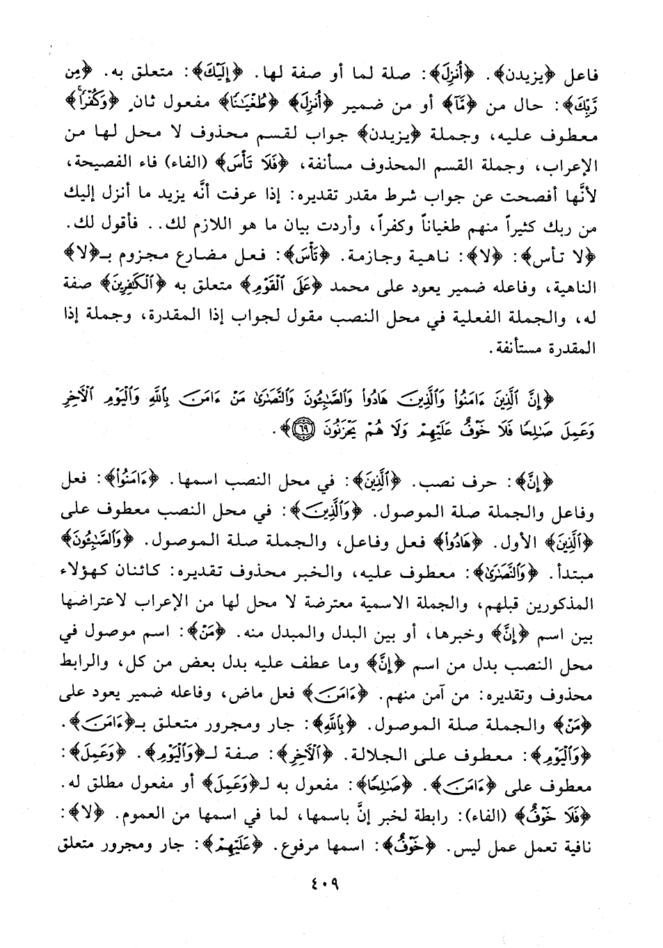 فاعل (يزيدن). {أُنزِلَ}: صلة لما أو صفة لها. {إِلَيْكَ}: متعلق به. {مِنْ رَبِّكَ}: حال من {مَا} أو من ضمير {أُنْزِلَ} {طُغْيَانًا} مفعول ثانٍ {وَكُفْرًا} معطوف عليه، وجملة (يزيدن) جواب لقسم محذوف لا محل لها من الإعراب، وجملة القسم المحذوف مستأنفة، {فَلَا تَأسَ} (الفاء) فاء الفصيحة، لأنَّها أفصحت عن جواب شرط مقدر تقديره: إذا عرفت أنَّه يزيد ما أنزل إليك من ربك كثيرًا منهم طغيانًا وكفرًا، وأردت بيان ما هو اللازم لك .. فأقول لك. (لا تأس): (لا): ناهية وجازمة. {تَأسَ}: فعل مضارع مجزوم بـ (لا) الناهية، وفاعله ضمير يعود على محمَّد {عَلَى الْقَوْمِ} متعلق به {الْكَافِرِينَ} صفة له، والجملة الفعلية في محل النصب مقول لجواب إذا المقدرة، وجملة إذا المقدرة مستأنفة.