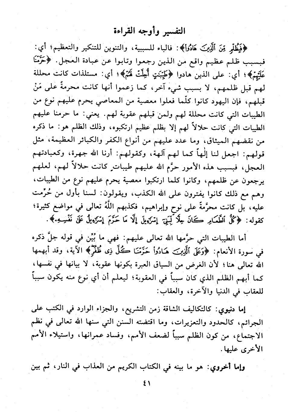 160 - {فَبِظُلْمٍ مِنَ الَّذِينَ هَادُوا}: فالباء للسببية، والتنوين للتنكير والتعظيم؛ أي: فبسبب ظلم عظيم واقع من الذين رجعوا وتابوا عن عبادة العجل. {حَرَّمْنَا عَلَيْهِمْ}؛ أي: على الذين هادوا {طَيِّبَاتٍ أُحِلَّتْ لَهُمْ}؛ أي؛ مستلذات كانت محللة لهم قبل ظلمهم، لا بسبب شيء آخر، كما زعموا أنها كانت محرمة على مَنْ قبلهم، فإن اليهود كانوا كلّما فعلوا معصية من المعاصي يحرم عليهم نوع من الطيبات التي كانت محللة لهم ولمن قبلهم عقوبة لهم. يعني: ما حرمنا عليهم الطيبات التي كانت حلالًا لهم إلا بظلم عظيم ارتكبوه، وذلك الظلم هو: ما ذكره من نقضهم الميثاق، وما عدد عليهم من أنواع الكفر والكبائر العظيمة، مثل قولهم: اجعل لنا إلهًا كما لهم آلهة، وكقولهم: أرنا الله جهرة، وكعبادتهم العجل، فبسبب هذه الأمور حرَّم الله عليهم طيباتٍ كانت حلالًا لهم، لعلهم يرجعون عن ظلمهم، وكانوا كما ارتكبوا معصية يحرم عليهم نوع من الطيبات، وهم مع ذلك كانوا يفترون على الله الكذب، ويقولون: لسنا بأول من حُرِّمت عليه، بل كانت محرَّمة على نوح وإبراهيم، فكذبهم اللهُ تعالى في مواضع كثيرة؛ كقوله: {كُلُّ الطَّعَامِ كَانَ حِلًّا لِبَنِي إِسْرَائِيلَ إِلَّا مَا حَرَّمَ إِسْرَائِيلُ عَلَى نَفْسِهِ}.