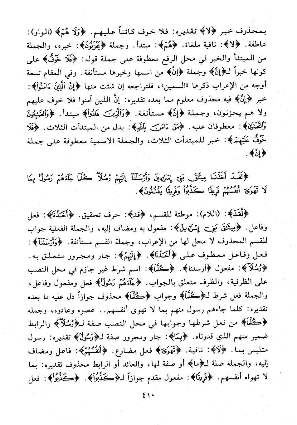 {لَقَدْ}: (اللام): موطئة للقسم، (قد): حرف تحقيق. {أَخَذْنَا}: فعل وفاعل. {مِيثَاقَ بَنِي إِسْرَائِيلَ}: مفعول به ومضاف إليه، والجملة الفعلية جواب للقسم المحذوف لا محل لها من الإعراب، وجملة القسم مستأنفة. {وَأَرْسَلْنَا}: فعل وفاعل معطوف على {أَخَذْنَا}. {إِلَيْهِمْ}: جار ومجرور متعلق به. {رُسُلًا}: مفعول (أرسلنا). {كُلَّمَا}: اسم شرط غير جازم في محل النصب على الظرفية، والظرف متعلق بالجواب. {جَاءَهُمْ رَسُولٌ} فعل ومفعول وفاعل، والجملة فعل شرط لـ {كُلَّمَا} وجواب {كُلَّمَا} محذوف جوازًا دل عليه ما بعده تقديره: كلما جاءهم رسول منهم بما لا تهوى أنفسهم .. عصوه وعادوه، وجملة {كُلَّمَا} من فعل شرطها وجوابها في محل النصب صفة لـ {رُسُلًا} والرابط ضمير منهم الذي قدرناه. {بِمَا}: جار ومجرور صفة لـ {رَسُولٌ} تقديره: رسول متلبس بما. {لَا}: نافية. {تَهْوَى} فعل مضارع. {أَنْفُسُهُمْ}: فاعل ومضاف إليه، والجملة صلة لـ (ما) أو صفة لها، والعائد أو الرابط محذوف تقديره: بما لا تهواه أنفسهم. {فَرِيقًا}: مفعول مقدم جوازًا لـ {كَذَّبُوا}. {كَذَّبُوا}: فعل
