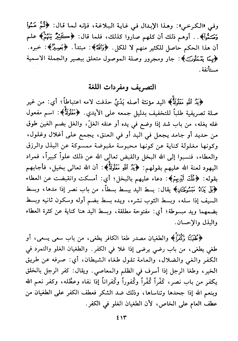 {يَدُ اللَّهِ مَغْلُولَةٌ} اليد مؤنثة أصله يَدْيٌ حذفت لامه اعتباطًا؛ أي: من غير صلة تصريفية طلبًا للتخفيف بدليل جمعه على الأيدى. {مَغْلُولَةٌ}: اسم مفعول غله يغله، من باب شد إذا وضع في يده أو عنقه الغلّ، والغل بضم الغين طوق من حديد أو جامد يجعل في اليد أو في العنق، يجمع على أغلال وغلول، وكونها مغلولة كناية عن كونها محبوسة مقبوضة ممسوكة عن البذل والرزق والعطاء، فنسبوا إلى الله البخل والقبض تعالى الله عن ذلك علوًّا كبيرًا، فمراد اليهود لعنة الله عليهم بقولهم: {يَدُ اللَّهِ مَغْلُولَةٌ}: أن الله تعالى بخيل، فأجابهم بقوله: {غُلَّتْ أَيْدِيهِمْ}: دعاء عليهم بالبخل؛ أي: أمسكت وانقبضت عن العطاء {بَلْ يَدَاهُ مَبْسُوطَتَانِ} يقال: بسط اليد يبسط بسطًا، من باب نصر إذا مدها, وبسط السيف إذا سله، وبسط الثوب نشره، ويده بسط بضم أوله وسكون ثانيه وبسط بضمهما ويد مبسوطة؛ أي: مفتوحة مطلقة، وبسط اليد هنا كناية عن كثرة العطاء والبذل والإحسان.