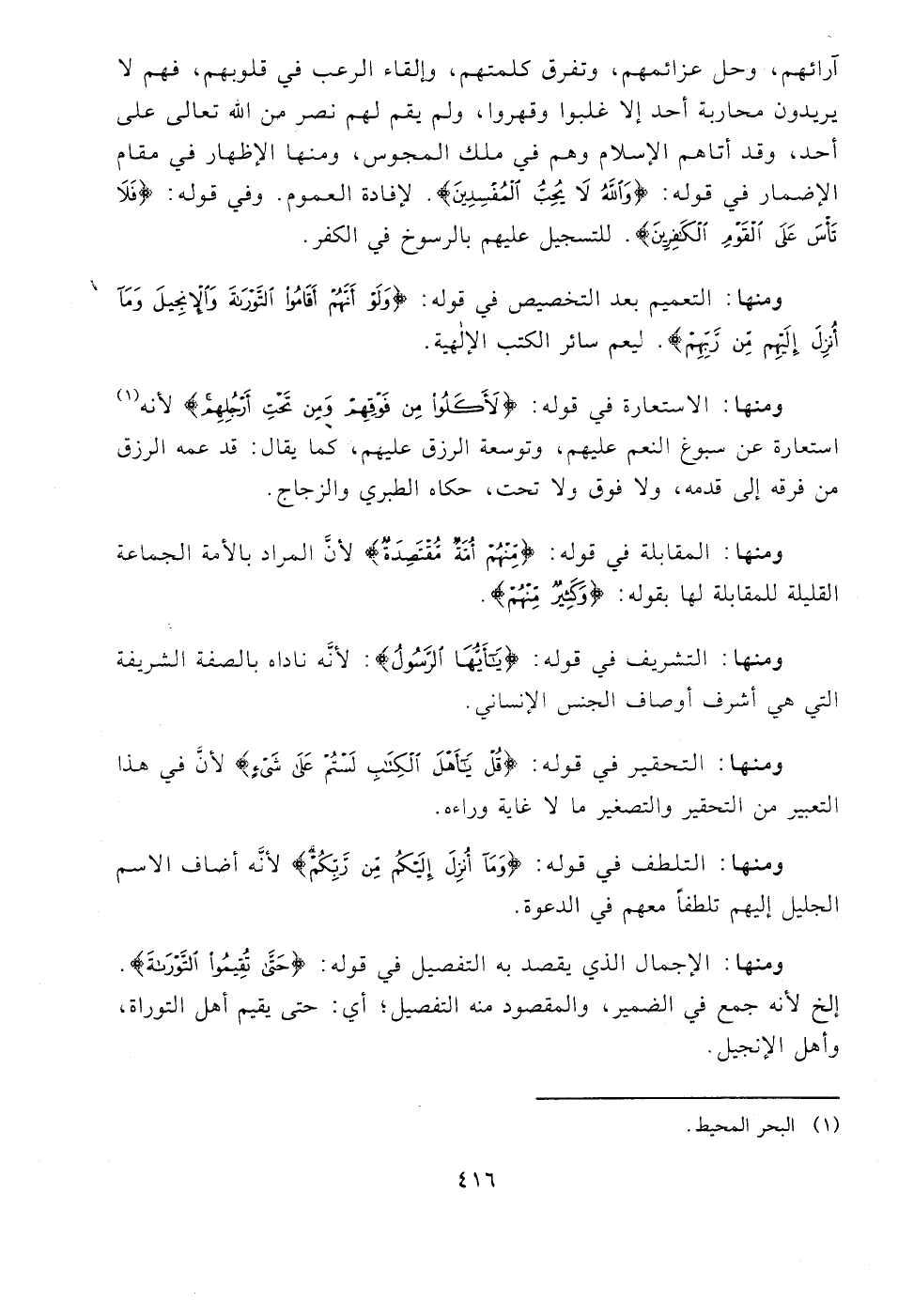 ومنها: الإجمال الذي يقصد به التفصيل في قوله حتى {حَتَّى تُقِيمُوا التَّوْرَاةَ}. إلخ لأنه جمع في الضمير، والمقصود منه التفصيل؛ أي: حتى يقيم أهل التوراة، وأهل الإنجيل.
