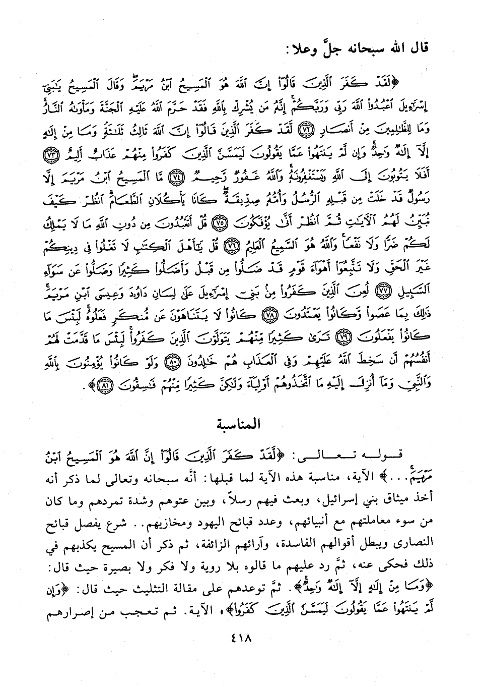 {لَقَدْ كَفَرَ الَّذِينَ قَالُوا إِنَّ اللَّهَ هُوَ الْمَسِيحُ ابْنُ مَرْيَمَ وَقَالَ الْمَسِيحُ يَا بَنِي إِسْرَائِيلَ اعْبُدُوا اللَّهَ رَبِّي وَرَبَّكُمْ إِنَّهُ مَنْ يُشْرِكْ بِاللَّهِ فَقَدْ حَرَّمَ اللَّهُ عَلَيْهِ الْجَنَّةَ وَمَأوَاهُ النَّارُ وَمَا لِلظَّالِمِينَ مِنْ أَنْصَارٍ (72) لَقَدْ كَفَرَ الَّذِينَ قَالُوا إِنَّ اللَّهَ ثَالِثُ ثَلَاثَةٍ وَمَا مِنْ إِلَهٍ إِلَّا إِلَهٌ وَاحِدٌ وَإِنْ لَمْ يَنْتَهُوا عَمَّا يَقُولُونَ لَيَمَسَّنَّ الَّذِينَ كَفَرُوا مِنْهُمْ عَذَابٌ أَلِيمٌ (73) أَفَلَا يَتُوبُونَ إِلَى اللَّهِ وَيَسْتَغْفِرُونَهُ وَاللَّهُ غَفُورٌ رَحِيمٌ (74) مَا الْمَسِيحُ ابْنُ مَرْيَمَ إِلَّا رَسُولٌ قَدْ خَلَتْ مِنْ قَبْلِهِ الرُّسُلُ وَأُمُّهُ صِدِّيقَةٌ كَانَا يَأكُلَانِ الطَّعَامَ انْظُرْ كَيْفَ نُبَيِّنُ لَهُمُ الْآيَاتِ ثُمَّ انْظُرْ أَنَّى يُؤْفَكُونَ (75) قُلْ أَتَعْبُدُونَ مِنْ دُونِ اللَّهِ مَا لَا يَمْلِكُ لَكُمْ ضَرًّا وَلَا نَفْعًا وَاللَّهُ هُوَ السَّمِيعُ الْعَلِيمُ (76) قُلْ يَا أَهْلَ الْكِتَابِ لَا تَغْلُوا فِي دِينِكُمْ غَيْرَ الْحَقِّ وَلَا تَتَّبِعُوا أَهْوَاءَ قَوْمٍ قَدْ ضَلُّوا مِنْ قَبْلُ وَأَضَلُّوا كَثِيرًا وَضَلُّوا عَنْ سَوَاءِ السَّبِيلِ (77) لُعِنَ الَّذِينَ كَفَرُوا مِنْ بَنِي إِسْرَائِيلَ عَلَى لِسَانِ دَاوُودَ وَعِيسَى ابْنِ مَرْيَمَ ذَلِكَ بِمَا عَصَوْا وَكَانُوا يَعْتَدُونَ (78) كَانُوا لَا يَتَنَاهَوْنَ عَنْ مُنْكَرٍ فَعَلُوهُ لَبِئْسَ مَا كَانُوا يَفْعَلُونَ (79) تَرَى كَثِيرًا مِنْهُمْ يَتَوَلَّوْنَ الَّذِينَ كَفَرُوا لَبِئْسَ مَا قَدَّمَتْ لَهُمْ أَنْفُسُهُمْ أَنْ سَخِطَ اللَّهُ عَلَيْهِمْ وَفِي الْعَذَابِ هُمْ خَالِدُونَ (80) وَلَوْ كَانُوا يُؤْمِنُونَ بِاللَّهِ وَالنَّبِيِّ وَمَا أُنْزِلَ إِلَيْهِ مَا اتَّخَذُوهُمْ أَوْلِيَاءَ وَلَكِنَّ كَثِيرًا مِنْهُمْ فَاسِقُونَ (81)}.