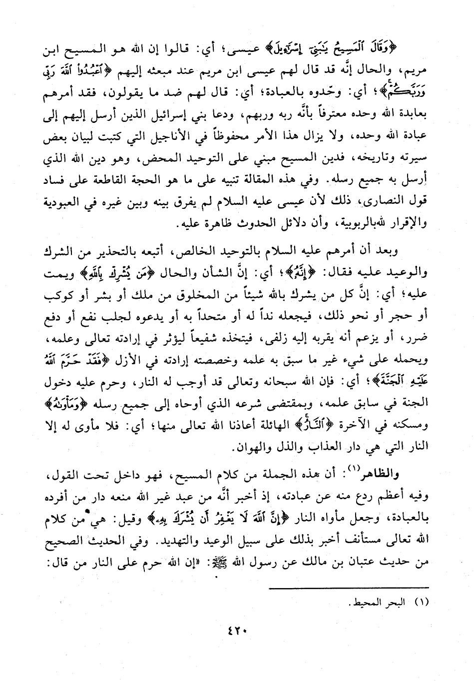 والظاهر (¬1): أن هذه الجملة من كلام المسيح، فهو داخل تحت القول، وفيه أعظم ردع منه عن عبادته، إذ أخبر أنَّه من عبد غير الله منعه دار من أفرده بالعبادة، وجعل مأواه النار {إِنَّ اللَّهَ لَا يَغْفِرُ أَنْ يُشْرَكَ بِهِ} وقيل: هي من كلام الله تعالى مستأنف أخبر بذلك على سبيل الوعيد والتهديد. وفي الحديث الصحيح من حديث عتبان بن مالك عن رسول الله - صلى الله عليه وسلم -: "إن الله حرم على النار من قال: