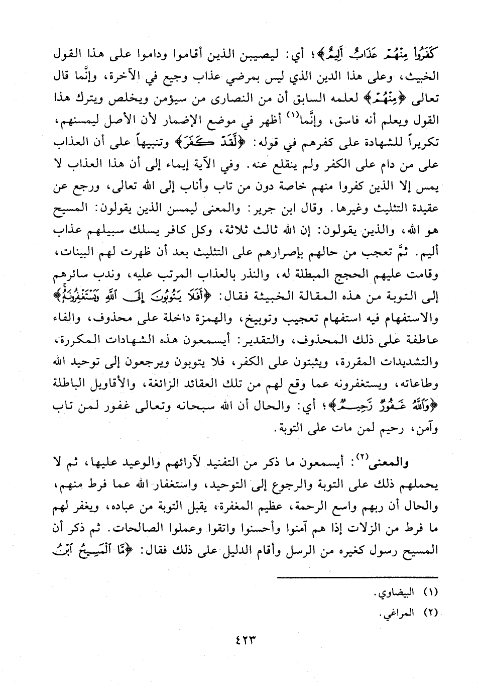74 - ثم تعجب من حالهم بإصرارهم على التثليث بعد أن ظهرت لهم البينات، وقامت عليهم الحجج المبطلة له، والنذر بالعذاب المرتب عليه، وندب سائرهم إلى التوبة من هذه المقالة الخبيثة فقال: {أَفَلَا يَتُوبُونَ إِلَى اللَّهِ وَيَسْتَغْفِرُونَهُ} والاستفهام فيه استفهام تعجيب وتوبيخ، والهمزة داخلة على محذوف، والفاء عاطفة على ذلك المحذوف، والتقدير: أيسمعون هذه الشهادات المكررة، والتشديدات المقررة، ويثبتون على الكفر، فلا يتوبون ويرجعون إلى توحيد الله وطاعاته، ويستغفرونه عما وقع لهم من تلك العقائد الزائغة، والأقاويل الباطلة {وَاللَّهُ غَفُورٌ رَحِيمٌ}؛ أي: والحال أن الله سبحانه وتعالى غفور لمن تاب وآمن، رحيم لمن مات على التوبة.