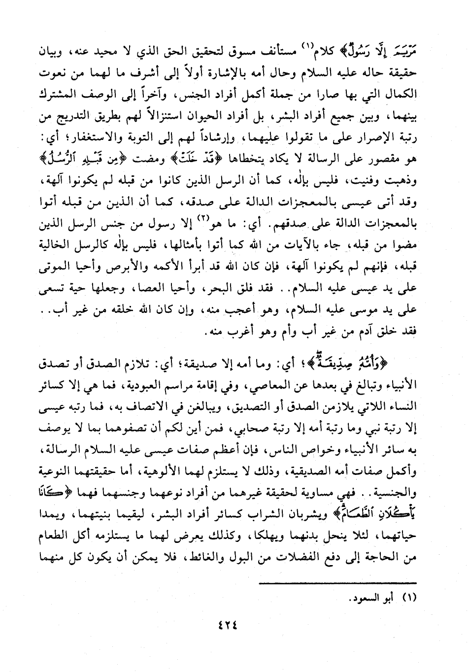 مَرْيَمَ إِلَّا رَسُولٌ} كلام (¬1) مستأنف مسوق لتحقيق الحق الذي لا محيد عنه، وبيان حقيقة حاله عليه السلام وحال أمه بالإشارة أولًا إلى أشرف مما لهما من نعوت الكمال التي بها صارا من جملة أكمل أفراد الجنس، وآخرًا إلى الوصف المشترك بينهما، وبين جميع أفراد البشر، بل أفراد الحيوان استنزالًا لهم بطريق التدريج من رتبة الإصرار على ما تقولوا عليهما، وإرشادًا لهم إلى التوبة والاستغفار؛ أي: هو مقصور على الرسالة لا يكاد يتخطاها {قَدْ خَلَتْ} ومضت {مِنْ قَبْلِهِ الرُّسُلُ} وذهبت وفنيت، فليس بإله، كما أن الرسل الذين كانوا من قبله لم يكونوا آلهة، وقد أتى عيسى بالمعجزات الدالة على صدقه، كما أن الذين من قبله أتوا بالمعجزات الدالة على صدقهم. أي: ما هو (¬2) إلا رسول من جنس الرسل الذين مضوا من قبله، جاء بالآيات من الله كما أتوا بأمثالها، فليس بإله كالرسل الخالية قبله، فإنهم لم يكونوا آلهة، فإن كان الله قد أبرأ الأكمه والأبرص وأحيا الموتى على يد عيسى عليه السلام .. فقد فلق البحر، وأحيا العصا، وجعلها حية تسعى على يد موسى عليه السلام، وهو أعجب منه، وإن كان الله خلقه من غير أب .. فقد خلق آدم من غير أب وأم وهو أغرب منه.