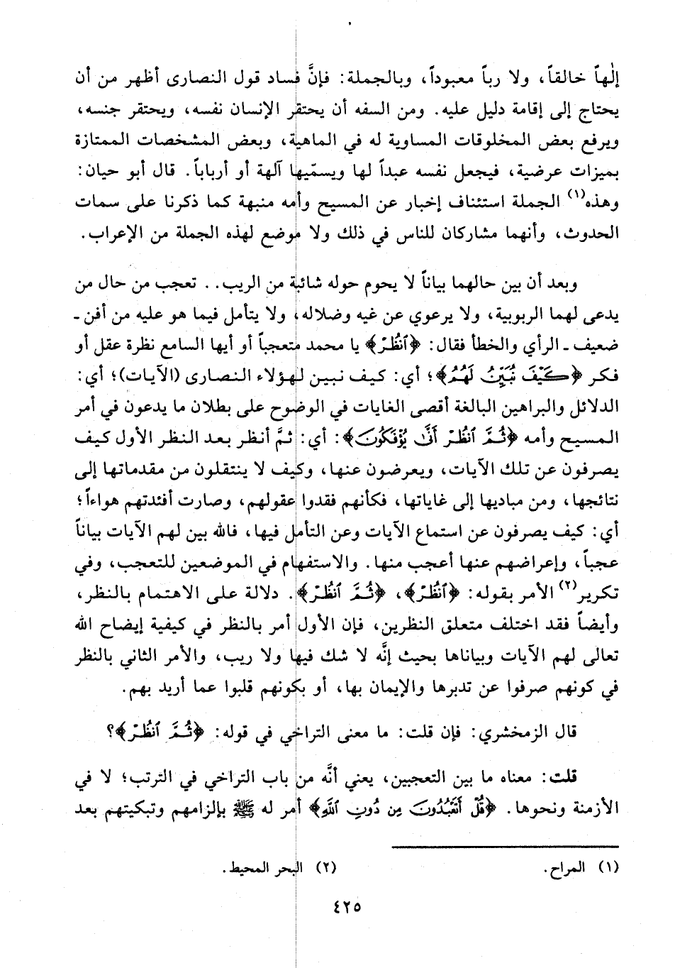 وبعد أن بين حالهما بيانًا لا يحوم حوله شائبة من الريب .. تعجب من حال من يدعى لهما الربوبية، ولا يرعوي عن غيه وضلاله، ولا يتأمل فيما هو عليه من أفن - ضعيف - الرأي والخطأ فقال: {اْنظُرْ} يا محمد متعجبًا أو أيها السامع نظرة عقل أو فكر {كَيْفَ نُبَيِّنُ لَهُمُ}؛ أي: كيف نبين لهؤلاء النصارى (الآيات)؛ أي: الدلائل والبراهين البالغة أقصى الغايات في الوضوح على بطلان ما يدعون في أمر المسيح وأمه {ثُمَّ انْظُرْ أَنَّى يُؤْفَكُونَ}: أي: ثمّ انظر بعد النظر الأول كيف يصرفون عن تلك الآيات، ويعرضون عنها، وكيف لا ينتقلون من مقدماتها إلى نتائجها، ومن مباديها إلى غاياتها، فكأنهم فقدوا عقولهم، وصارت أفئدتهم هواءًا؛ أي: كيف يصرفون عن استماع الآيات وعن التأمل فيها، فالله بين لهم الآيات بيانًا عجبًا، وإعراضهم عنها أعجب منها. والاستفهام في الموضعين للتعجب، وفي تكرير (¬2) الأمر بقوله: {انْظُرْ}، {ثُمَّ انْظُرْ}. دلالة على الاهتمام بالنظر، وأيضًا فقد اختلف متعلق النظرين، فإن الأول أمر بالنظر في كيفية إيضاح الله تعالى لهم الآيات وبياناها بحيث إنَّه لا شك فيها ولا ريب، والأمر الثاني بالنظر في كونهم صرفوا عن تدبرها والإيمان بها، أو بكونهم قلبوا عما أريد بهم.
