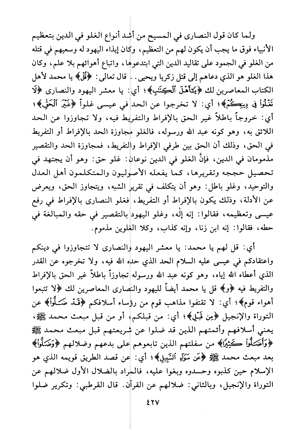 77 - ولما كان قول النصارى في المسيح من أشد أنواع الغلو في الدين بتعظيم الأنبياء فوق ما يجب أن يكون لهم من التعظيم، وكان إيذاء اليهود له وسعيهم في قتله من الغلو في الجمود على تقاليد الدين التي ابتدعوها، واتباع أهوائهم بلا علم، وكان هذا الغلو هو الذي دعاهم إلى قتل زكريا ويحيى .. قال تعالى: {قُلْ} يا محمد لأهل الكتاب المعاصرين لك {يَا أَهْلَ الْكِتَابِ}؛ أي: يا معشر اليهود والنصارى {لَا تَغْلُوا فِي دِينِكُمْ}؛ أي: لا تخرجوا عن الحد في عيسى غلوًّا {غَيْرَ الْحَقِّ}؛ أي: خروجًا باطلًا غير الحق بالإفراط والتفريط فيه، ولا تجاوزوا عن الحد اللائق به، وهو كونه عبد الله ورسوله، فالغلو مجاوزة الحد بالإفراط أو التفريط في الحق، وذلك أن الحق بين طرفي الإفراط والتفريط، فمجاوزة الحد والتقصير مذمومان في الدين، فإنَّ الغلو في الدين نوعان: غلو حق: وهو أن يجتهد في تحصيل حججه وتقريرها، كما يفعله الأصوليون والمتكلمون أهل العدل والتوحيد، وغلو باطل: وهو أن يتكلف في تقرير الشبه، ويتجاوز الحق، ويعرض عن الأدلة، وذلك يكون بالإفراط أو التفريط، فغلو النصارى بالإفراط في رفع عيسى وتعظيمه، فقالوا: إنه إله، وغلو اليهود بالتقصير في حقه والمبالغة في حطه، فقالوا: إنه ابن زنا، وإنه كذاب، وكلا الغلوين مذموم.