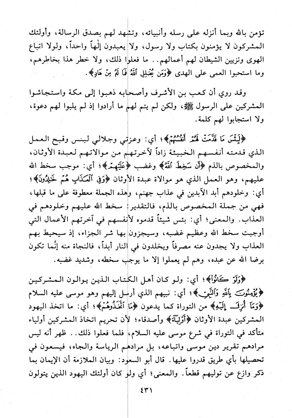 81 - {وَلَوْ كَانُوا}؛ أي: ولو كان أهل الكتاب الذين يوالون المشركين {يُؤْمِنُونَ بِاللَّهِ وَالنَّبِيِّ}؛ أي: نبيهم الذي أرسل إليهم وهو موسى عليه السلام {وما أُنزِلَ إليهم} من التوراة كما يدعون {مَا اتَّخَذُوهُمْ}؛ أي: ما اتخذ اليهود المشركين عبدة الأوثان {أَوْلِيَاءَ} وأصدقاء؛ لأن تحريم اتخاذ المشركين أولياء متأكد في التوراة في شرع موسى عليه السلام، فلما فعلوا ذلك .. ظهر أنه ليس مرادهم تقرير دين موسى واتباعه، بل مرادهم الرياسة والجاه، فيسعون في تحصيلها بأي طريق قدروا عليها. قال أبو السعود: وبيان الملازمة أن الإيمان بما ذكر وازع عن توليهم قطعًا. والمعنى؛ أي ولو كان أولئك اليهود الذين يتولون