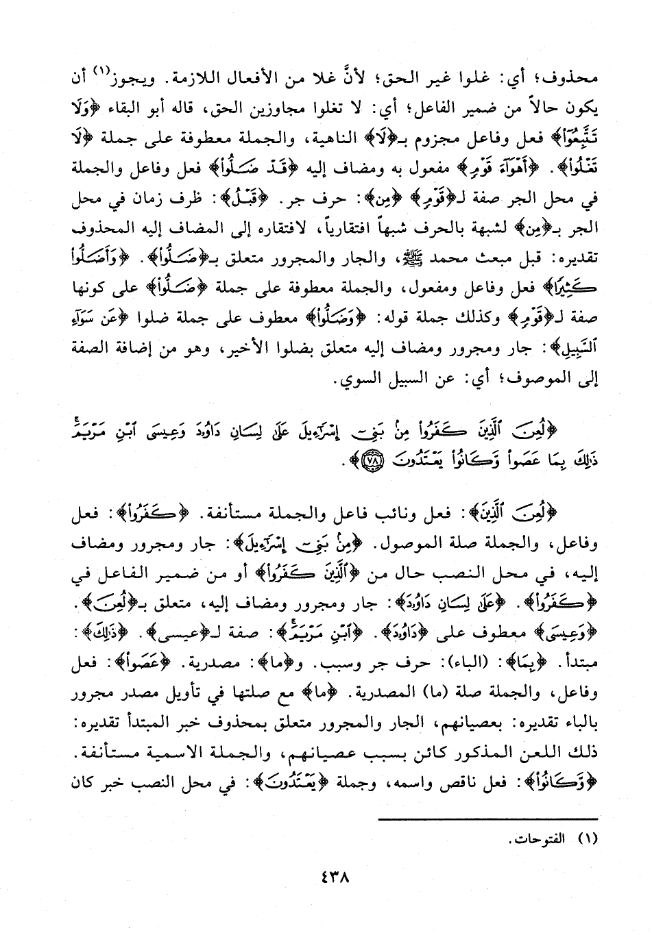 محذوف؛ أي: غلوا غير الحق؛ لأنَّ غلا من الأفعال اللازمة. ويجوز (¬1) أن يكون حالًا من ضمير الفاعل؛ أي: لا تغلوا مجاوزين الحق، قاله أبو البقاء {وَلَا تَتَّبِعُوا} فعل وفاعل مجزوم بـ {لَا} الناهية، والجملة معطوفة على جملة {لَا تَتَّبِعُوا}. {أَهْوَاءَ قَوْمٍ} مفعول به ومضاف إليه {قَدْ ضَلُّوا} فعل وفاعل والجملة في محل الجر صفة لـ {قَوْمٍ} {مِنْ}: حرف جر. {قَبْلُ}: ظرف زمان في محل الجر بـ {مِنْ} لشبهة بالحرف شبهًا افتقاريًّا، لافتقاره إلى المضاف إليه المحذوف تقديره: قبل مبعث محمد - صلى الله عليه وسلم -، والجار والمجرور متعلق بـ {ضَلُّوا}. {وَأَضَلُّوا كَثِيرًا} فعل وفاعل ومفعول، والجملة معطوفة على جملة {ضلوا} على كونها صفة لـ {قَوْمٍ} وكذلك جملة قوله: {وَضَلُّوا} معطوف على جملة ضلوا {عَنْ سَوَاءِ السَّبِيلِ}: جار ومجرور ومضاف إليه متعلق بضلوا الأخير، وهو من إضافة الصفة إلى الموصوف؛ أي: عن السبيل السوي.