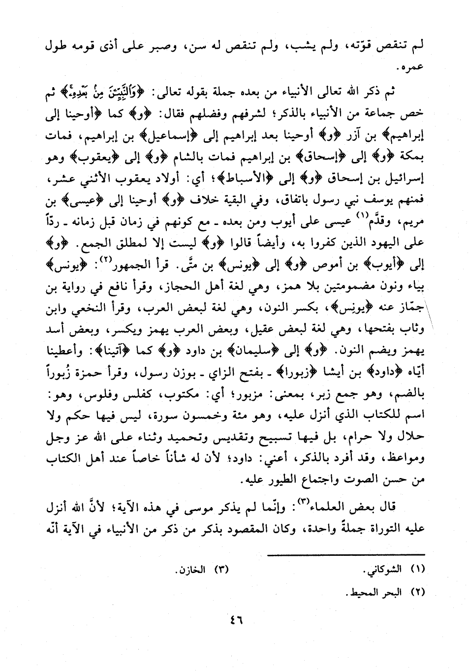 قال بعض العلماء (¬3): وإنما لم يذكر موسى في هذه الآية؛ لأنَّ الله أنزل عليه التوراة جملةً واحدة، وكان المقصود بذكر من ذكر من الأنبياء في الآية أنّه
