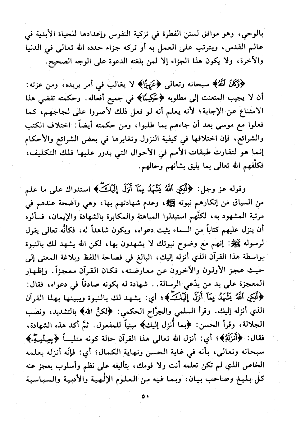 166 - وقوله عَزَّ وَجَلَّ: {لَكِنِ اللَّهُ يَشْهَدُ بِمَا أَنْزَلَ إِلَيْكَ} استدراك على ما عدم من السياق من إنكارهم نبوته - صلى الله عليه وسلم -، وعدم شهادتهم بها، وهي واضحة عندهم في مرتبة المشهود به، لكنَّهم استبدلوا المباهتة والمكابرة بالشهادة والإيمان, فسألوه أن ينزل عليهم كتابًا من السماء يثبت دعواه، ويكون شاهدًا له، فكأنَّه تعالى يقول لرسوله - صلى الله عليه وسلم -: إنهم مع وضوح نبوتك لا يشهدون بها, لكن الله يشهد لك بالنبوة بواسطة هذا القرآن الذي أنزله إليك، البالغ في فصاحة اللفظ وبلاغة المعنى إلى حيث عجز الأولون والآخرون عن معارضته، فكان القرآن معجزًا. وإظهار المعجزة على يد من يدِّعي الرسالة .. شهادة له بكونه صادقًا في دعواه، فقال: {لَكِنِ اللَّهُ يَشْهَدُ بِمَا أَنْزَلَ إِلَيْكَ}؛ أي: يشهد لك بالنبوة ويبينها بهذا القرآن الذي أنزله إليك. وقرأ السلمي والجرَّاح الحكمي: {لَكِنِ اللَّهُ} بالتشديد، ونصب الجلالة، وقرأ الحسن: {بِمَا أُنْزَلَ إِلَيْكَ} مبنيًّا للمفعول. ثم أكد هذه الشهادة، فقال: {أَنْزَلَهُ}؛ أي: أنزل الله تعالى هذا القرآن حالة كونه متلبسًا {بِعِلْمِهِ} سبحانه وتعالى، بأنه في غاية الحسن ونهاية الكمال؛ أي: فإنَّه أنزله بعلمه الخاص الذي لم تكن تعلمه أنت ولا قومك، بتأليفه على نظم وأسلوب يعجز عنه كل بليغ وصاحب بيان، وبما فيه من العلوم الإلهية والأدبية والسياسية