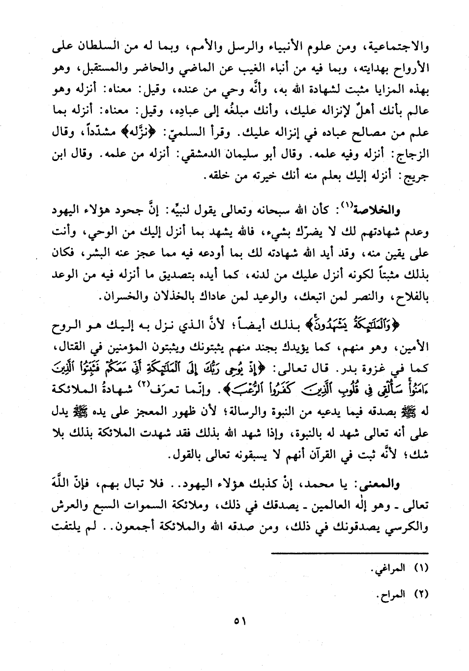 والخلاصة (¬1): كان الله سبحانه وتعالى يقول لنبيِّه: إنَّ جحود هؤلاء اليهود وعدم شهادتهم لك لا يضرّك بشيء, فالله يشهد بما أنزل إليك من الوحي، وأنت على يقين منه، وقد أيد الله شهادته لك بما أودعه فيه مما عجز عنه البشر، فكان بذلك مثبتًا لكونه أنزل عليك من لدنه، كما أيده بتصديق ما أنزله فيه من الوعد بالفلاح، والنصر لمن اتبعك، والوعيد لمن عاداك بالخذلان والخسران.