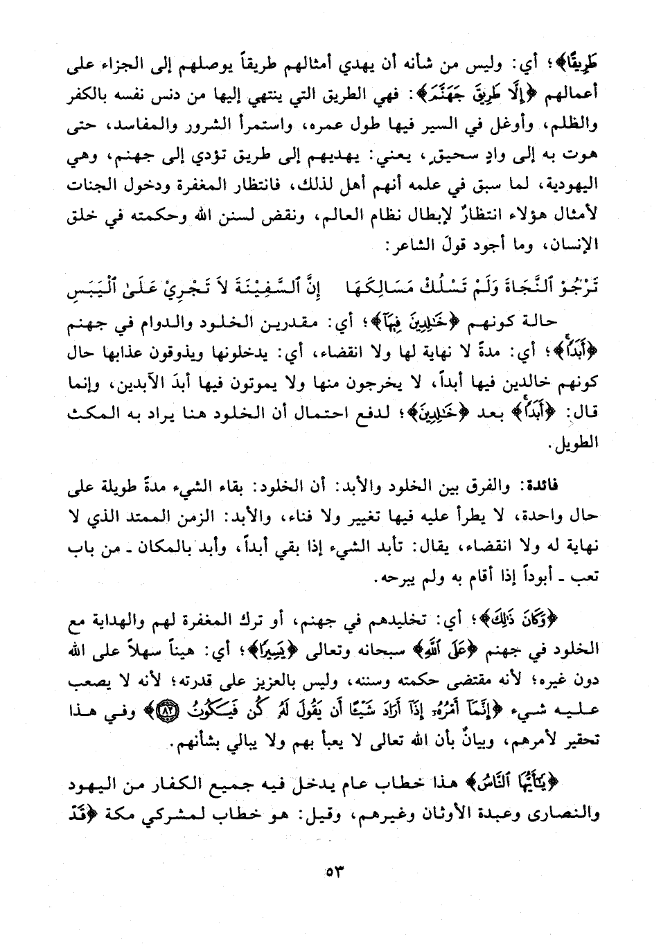 169 - {إِلَّا طَرِيقَ جَهَنَّمَ}: فهي الطريق التي ينتهي إليها من دنس نفسه بالكفر والظلم، وأوغل في السير فيها طول عمره، واستمرأ الشرور والمفاسد، حتى هوت به إلى وادٍ سحيقٍ، يعني: يهديهم إلى طريق تؤدي إلى جهنم، وهي اليهودية، لما سبق في علمه أنهم أهل لذلك، فانتظار المغفرة ودخول الجنات لأمثال هؤلاء انتظارٌ لإبطال نظام العالم، ونقض لسنن الله وحكمته في خلق الإنسان، وما أجود قولَ الشاعر: